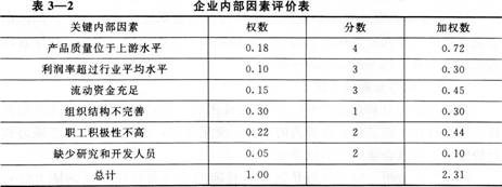 企业内部优势和劣势是相对于竞争对手而言的,表现在企业的各种资源和能力上。应分析企业具有哪些单项的优势和劣势,以及综合的优势和劣势。评价企业的总体优势、劣势时,应选择一些竞争中的重要资源、能力进行打分,然后给不同因素的重要性赋权进行总体评价(见表3—2)。