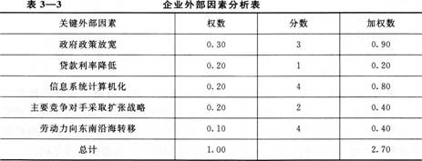 企业外部环境的机会是指环境中对企业有利的因素,如新技术的发明带来的成本降低等。企业的外部威胁是指环境中对企业不利的因素,如新的竞争对手的出现。外部机会和威胁的评价见表3—3。