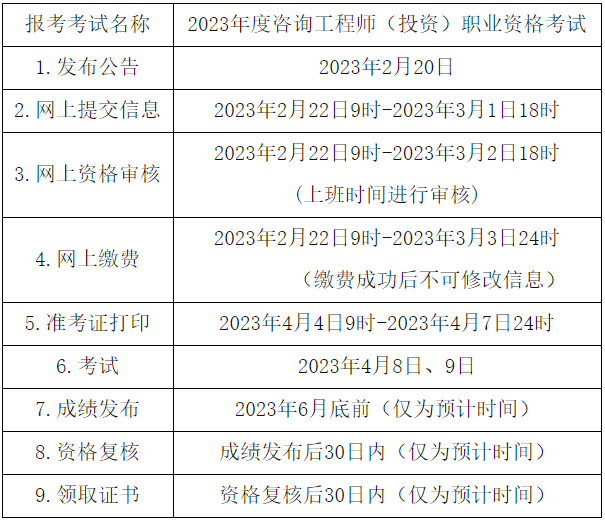 根据《人力资源社会保障部办公厅关于2023年度专业技术人员职业资格考试计划及有关事项的通知》(人社厅发〔2023〕3号)要求,2023年度咨询工程师(投资)职业资格考试于4月8日、9日举行,现将有关事项通知如下:
