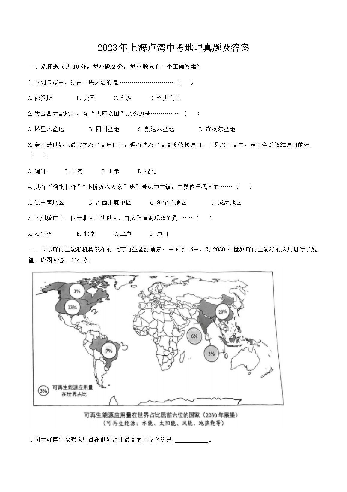 2023年上海卢湾中考地理真题及答案(Word版)06-23