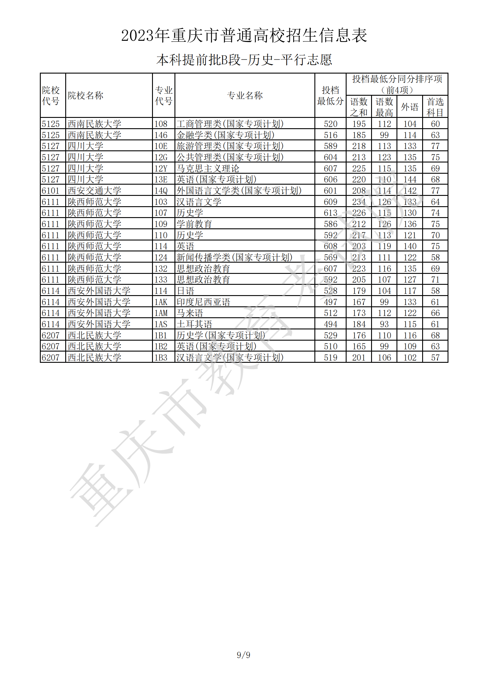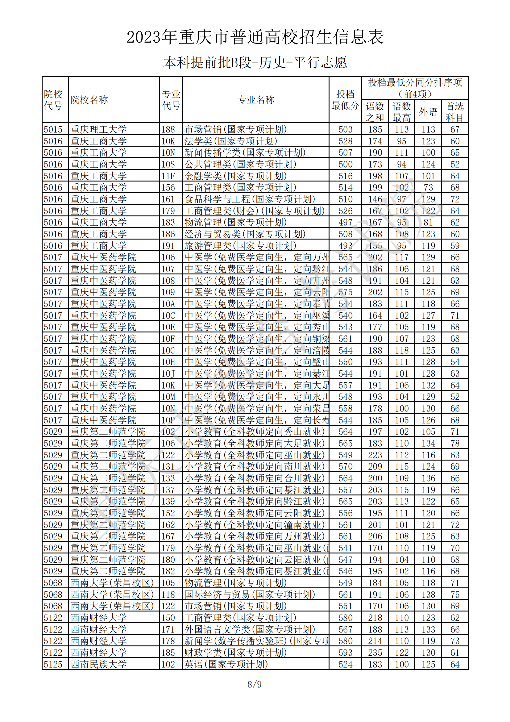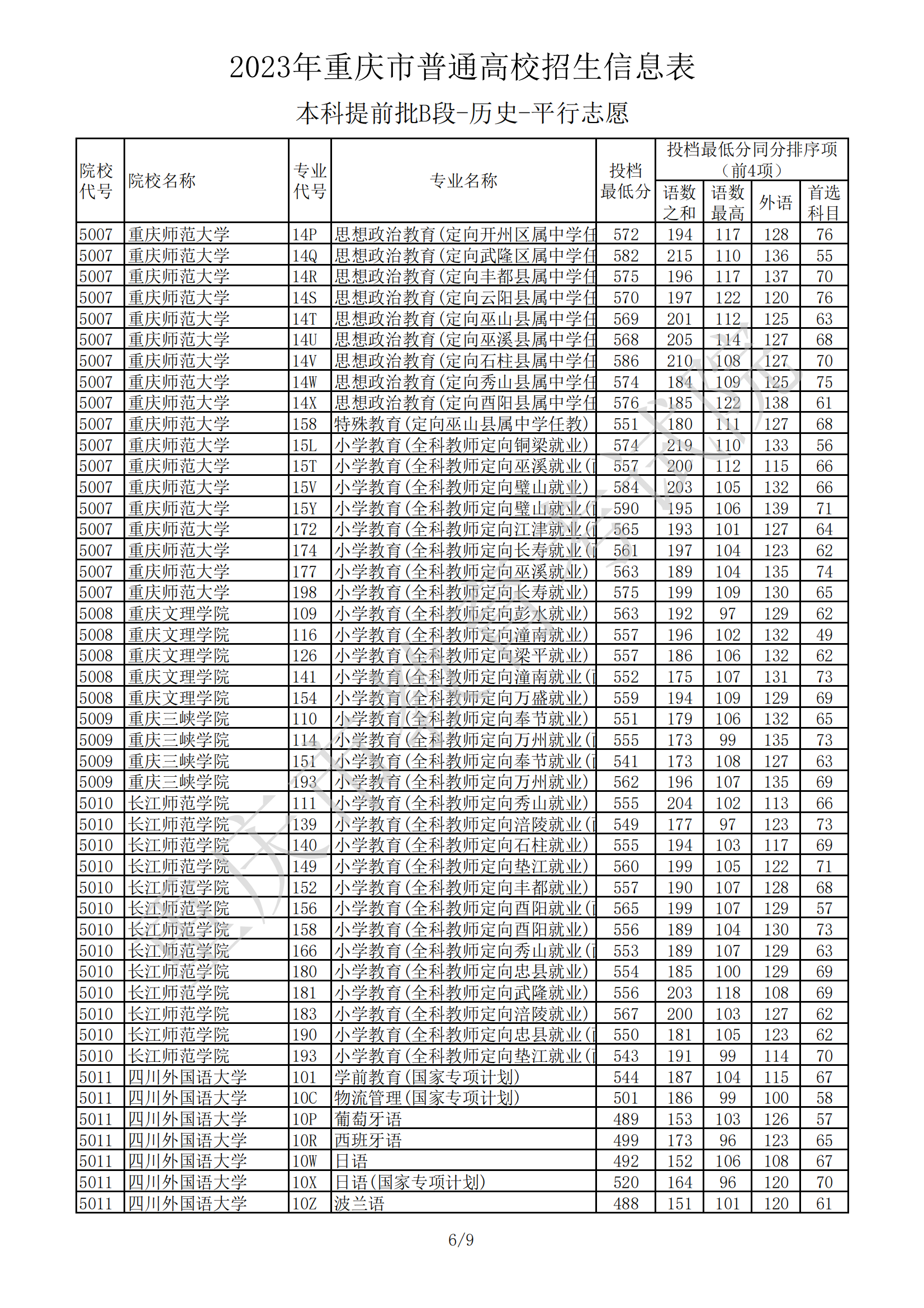 2023年重庆市普通高校招生信息表(本科提前批B段-历史-平行志愿)07-20