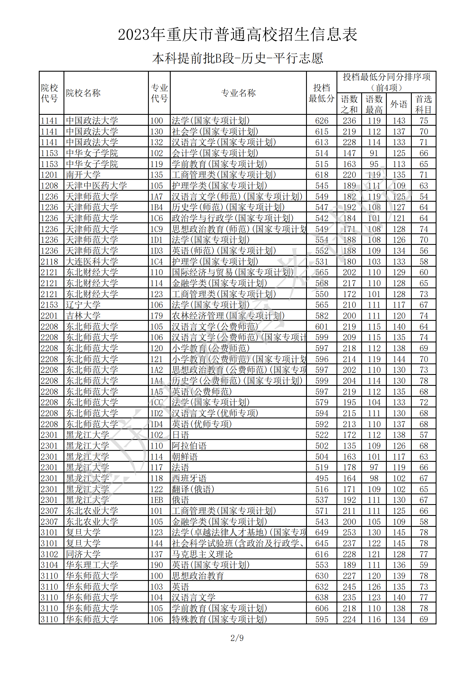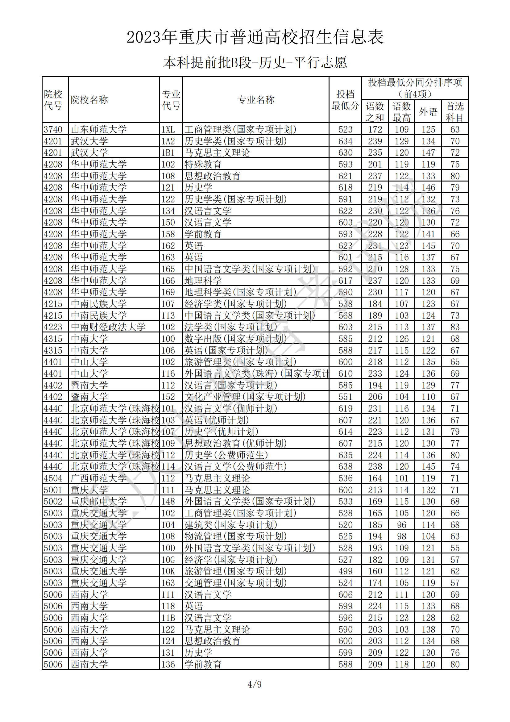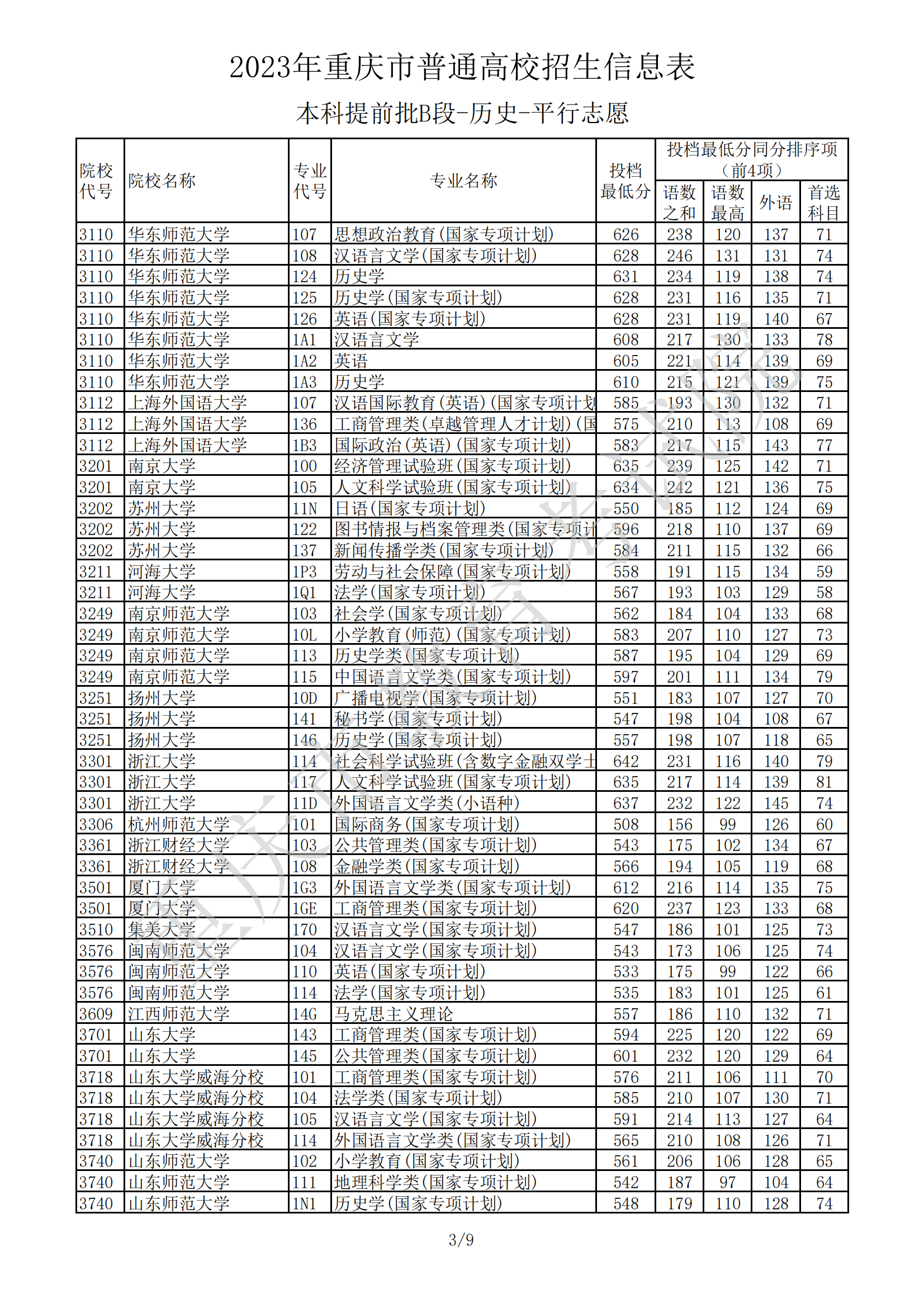 2023年重庆市普通高校招生信息表(本科提前批B段-历史-平行志愿)07-20