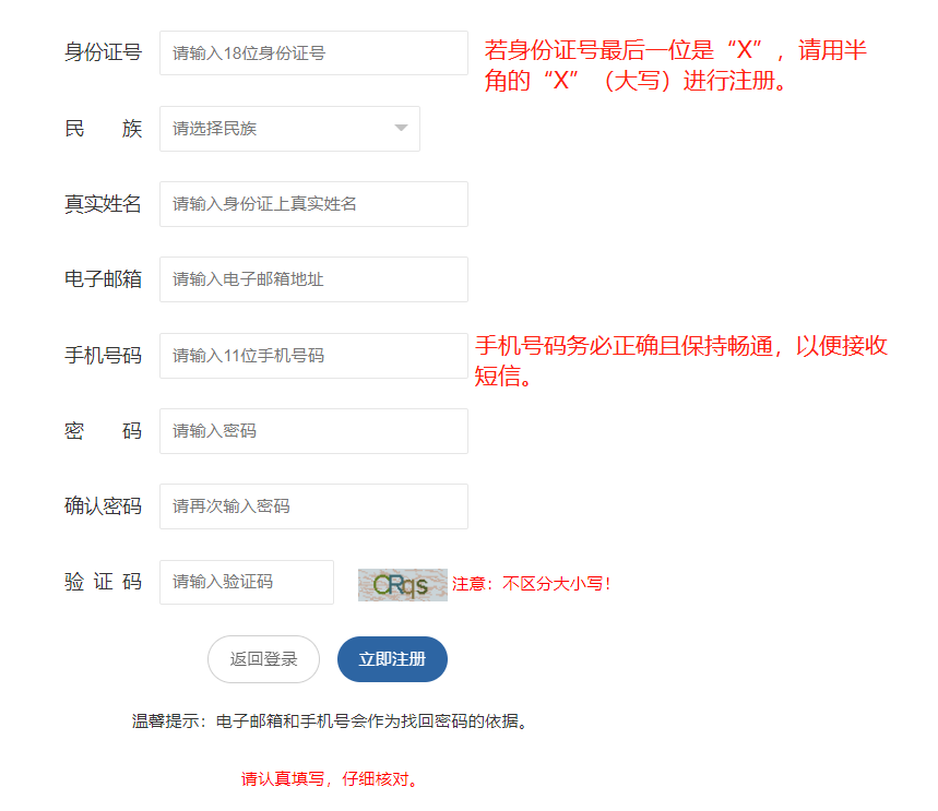 同一身份证号仅允许注册一次,请勿重复注册。应准确输入身份证号、姓名、民族,保证注册信息和本人身份证信息相符。用户名(身份证号)和密码要妥善保管,如密码丢失,可使用系统提供方式找回密码。用户名(身份证号)和密码如被他人盗用责任自负。