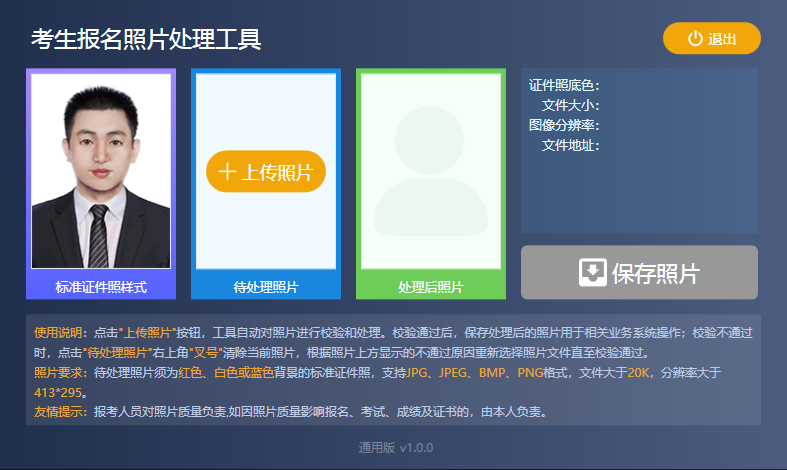 照片要求:待处理照片须为红色、白色或蓝色背景的标准证件照,支持JPG、JPEG、BMP、PNG格式,文件大于20K,分辨率大于413*295。