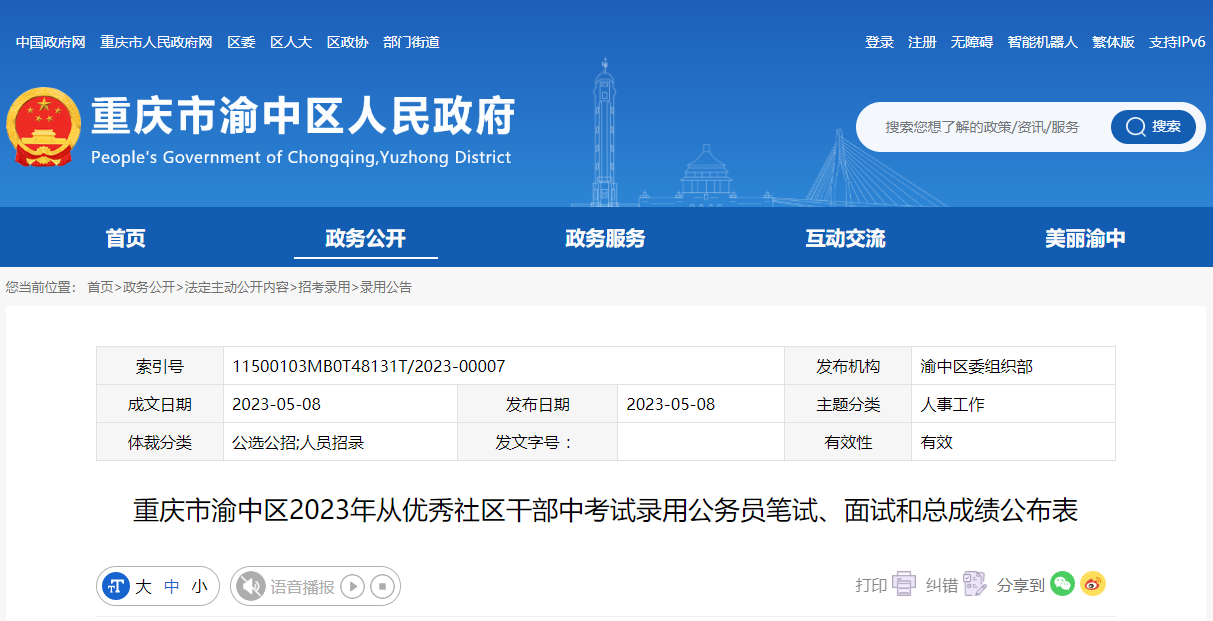 2023年重庆市渝中区从优秀社区干部中考试录用公务员笔试、面试和总成绩已公布05-10