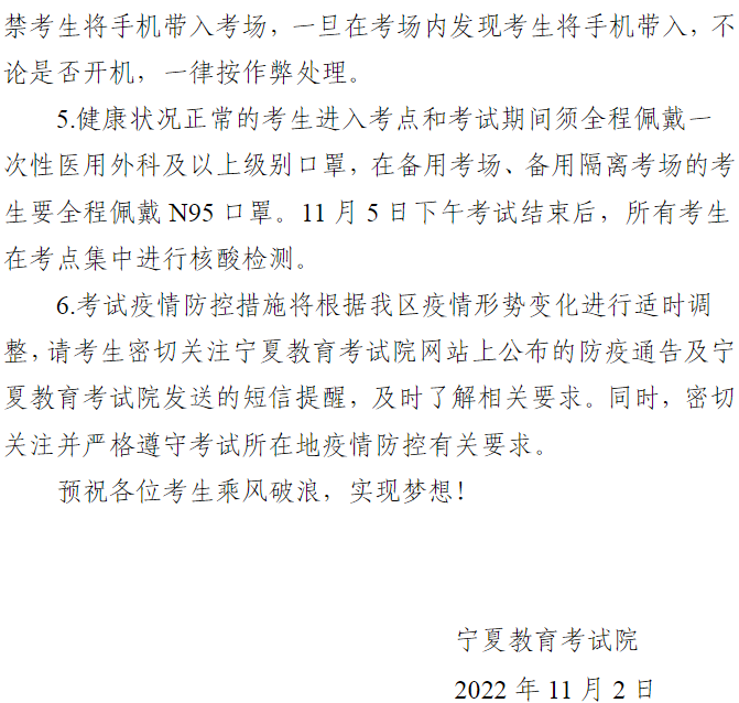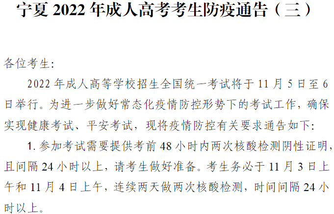 宁夏2022年成人高考考生防疫通告(三)11-03