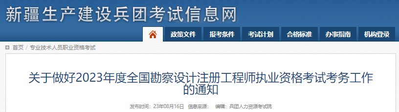 【#给排水工程师# 导语】®文档大全网从新疆生产建设兵团考试信息网获悉,《2023年新疆生产建设兵团勘察设计注册工程师执业资格考试报名通知》现已发布,2023年新疆生产建设兵团给排水工程师报名时间:8月28日-9月11日,考试时间:11月4日-5日,®文档大全网小编现将报考信息发布如下: