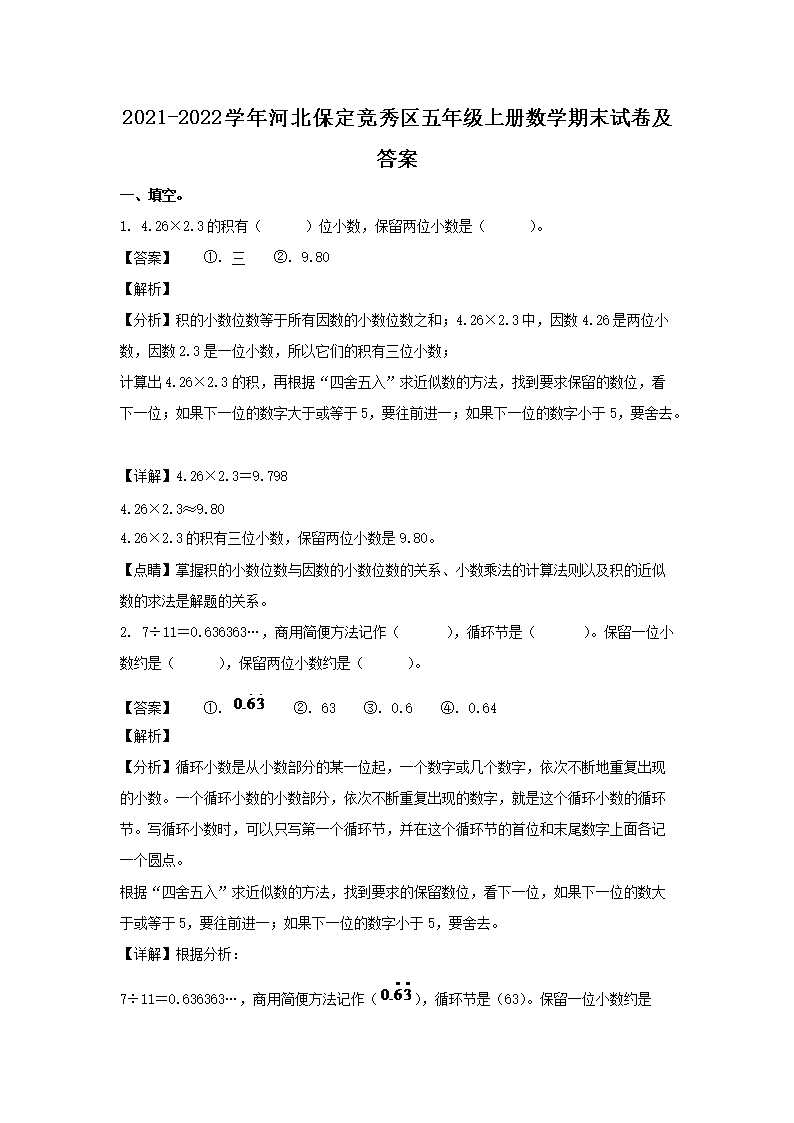 2021-2022学年河北保定竞秀区五年级上册数学期末试卷及答案(Word版)08-31