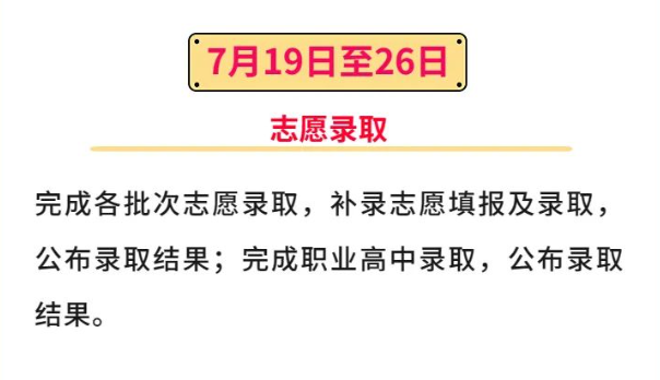完成各批次志愿录取,补录志愿填报及录取,公布录取结果;完成职业高中录取,公布录取结果。