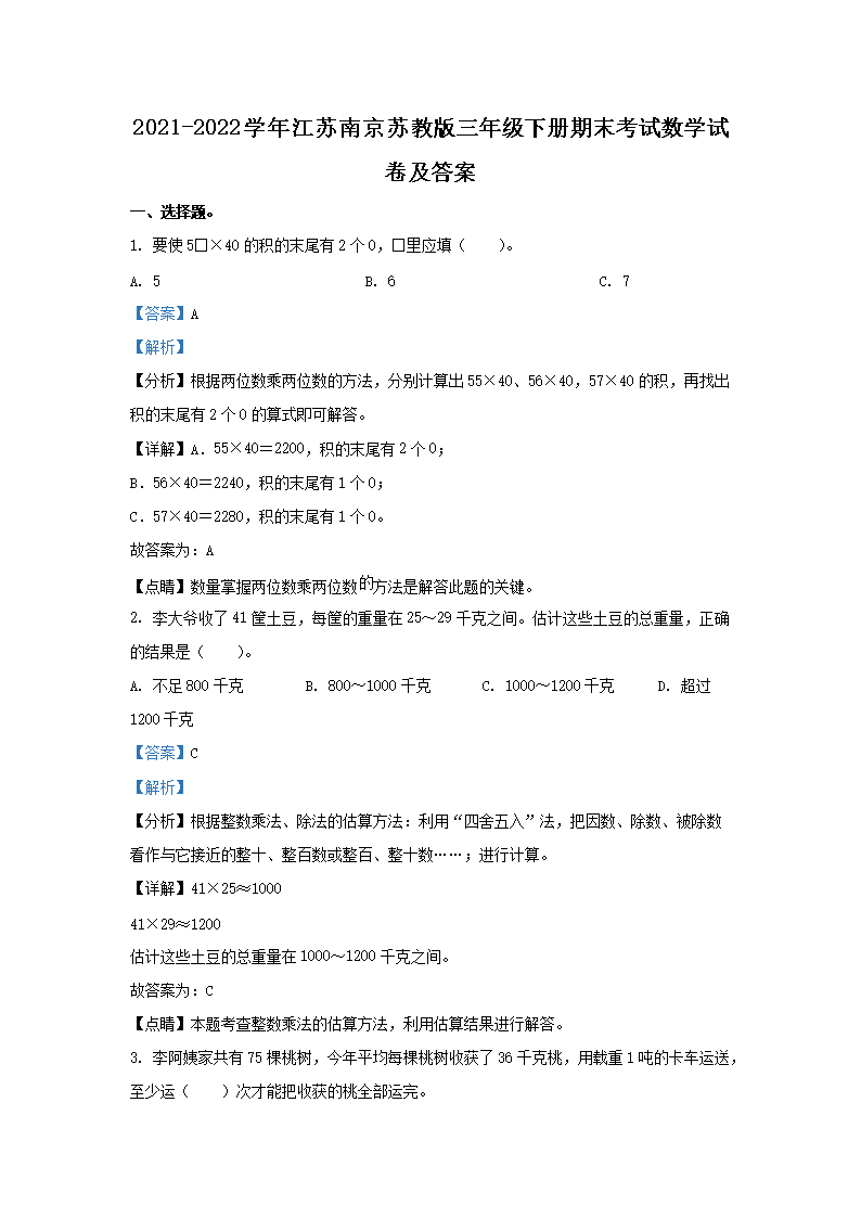 【文档预览】 文档大全网整理发布2021-2022学年江苏南京苏教版三年级下册期末考试数学试卷及答案(Word版),前五页预览如下: