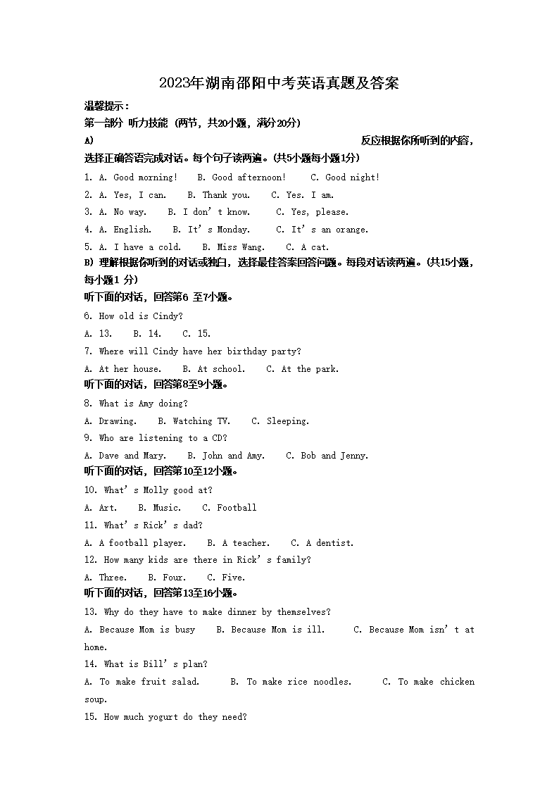 【文档预览】 文档大全网整理发布2023年湖南邵阳中考英语真题及答案(Word版),前五页预览如下: