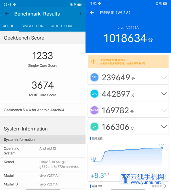 在安兔兔跑分中,iQOO 9可以很轻松地上到百万分级别与官方成绩相差无几,GeekBench 5单核1200以上、多核近3700,属于同平台较优表现。
