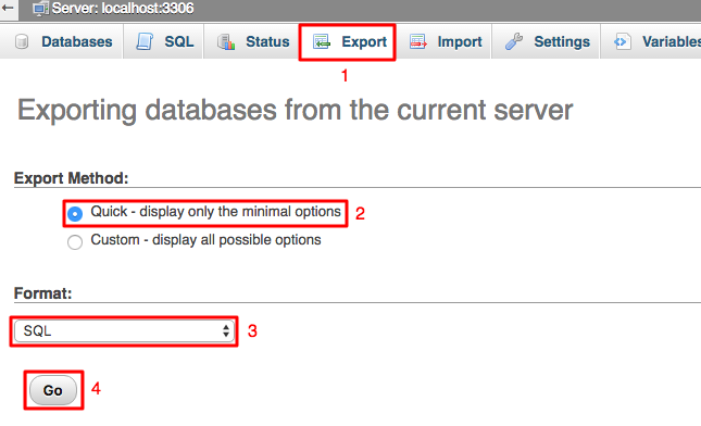 2.选择导出的方法,phpMyAdmin提供了两种导出方法,Quick – display only the minimal options 和 Custom – display all possible options。自定义导出方法允许更改不同的设置数量: