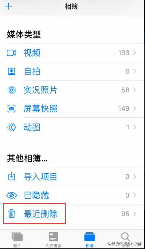 3、清理垃圾桶照片我们都知道iPhone删除照片后,并没有真正的删除,还在相册中的【最近删除】里保存,相当于一个“回收站”。【相册】-【最近删除】-【全部删除】才能清楚照片占用空间。