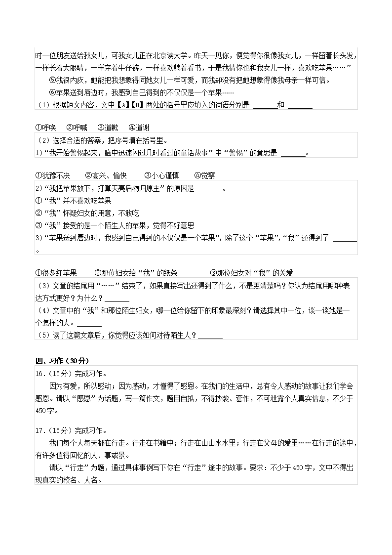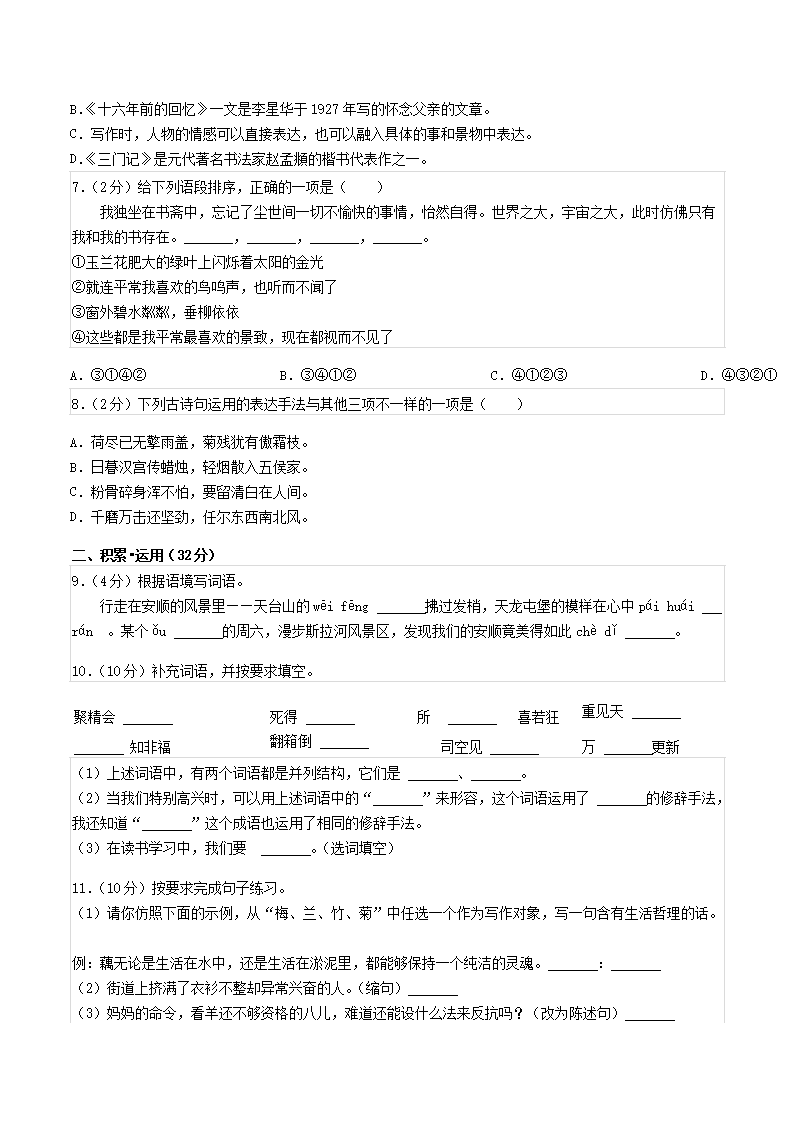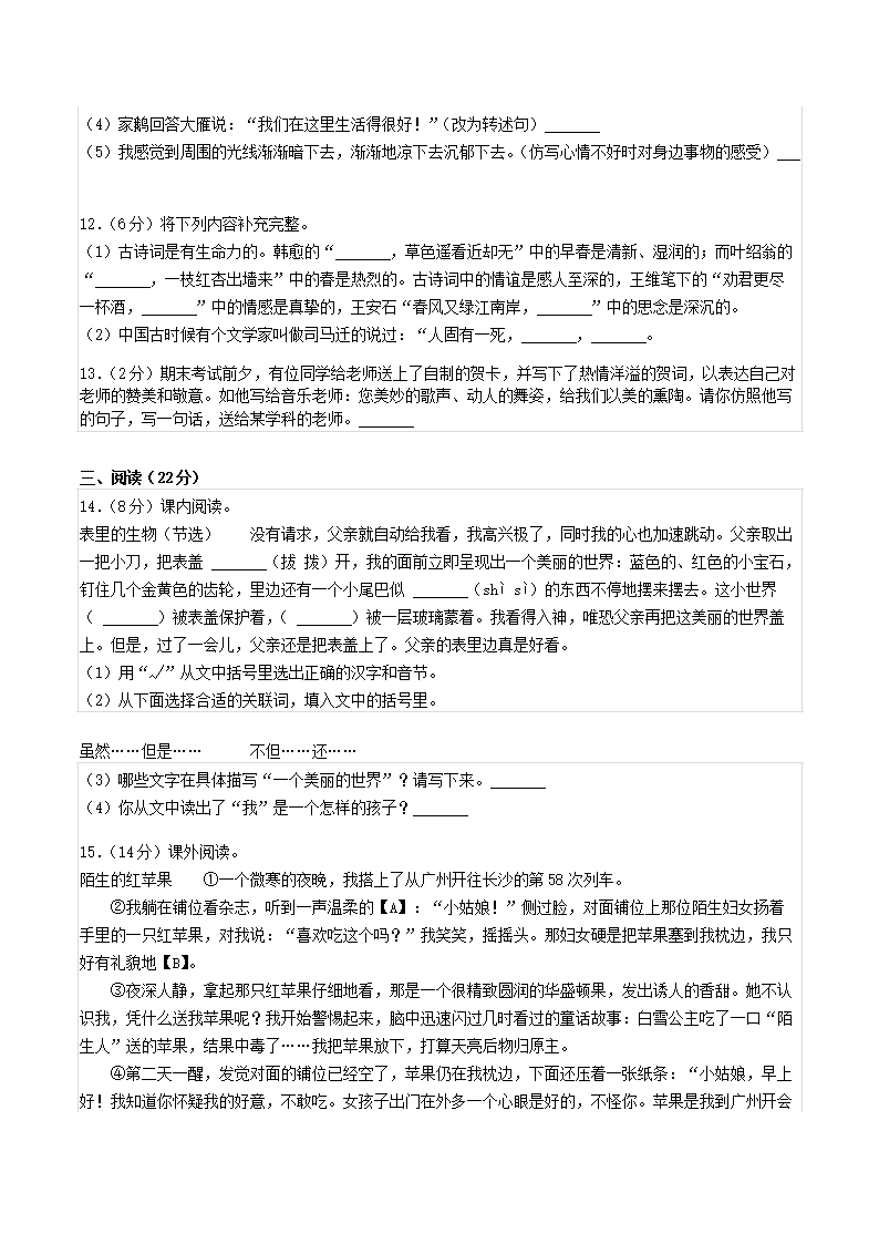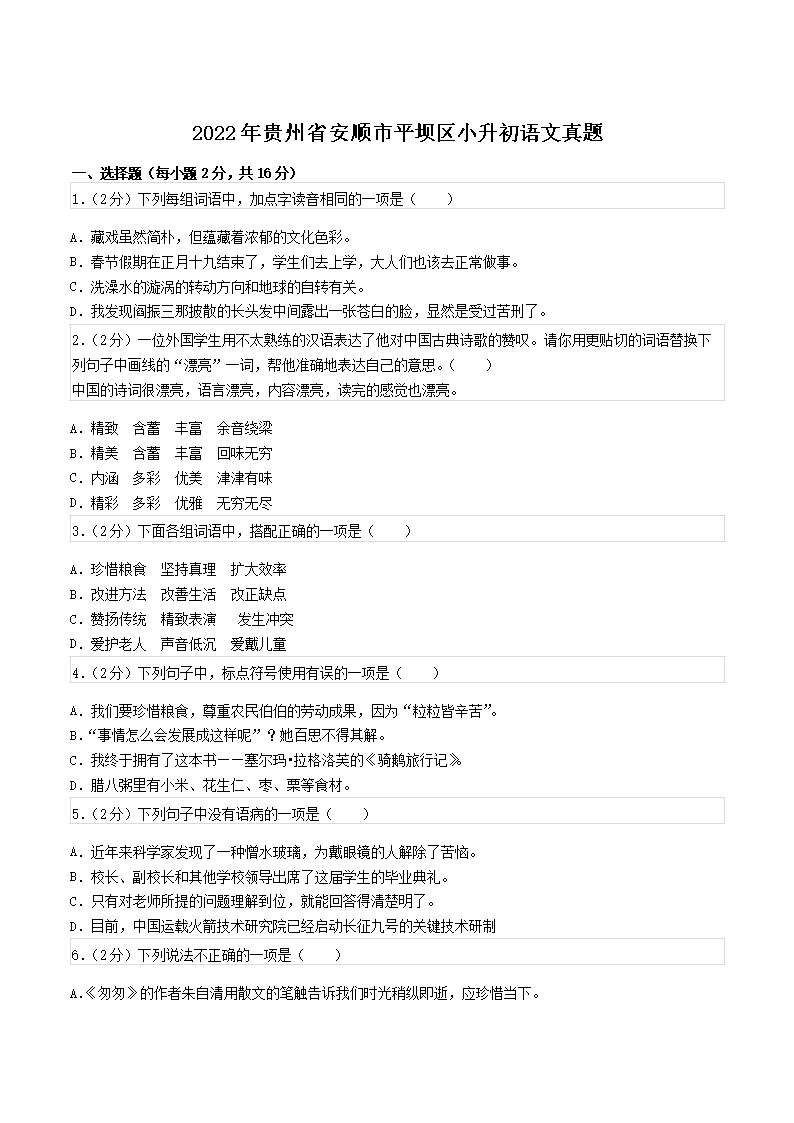 2022年贵州省安顺市平坝区小升初语文真题(Word版)09-01