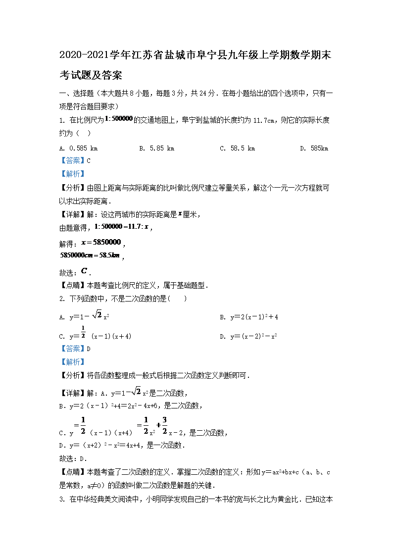 2020-2021学年江苏省盐城市阜宁县九年级上学期数学期末考试题及答案(Word版)09-29