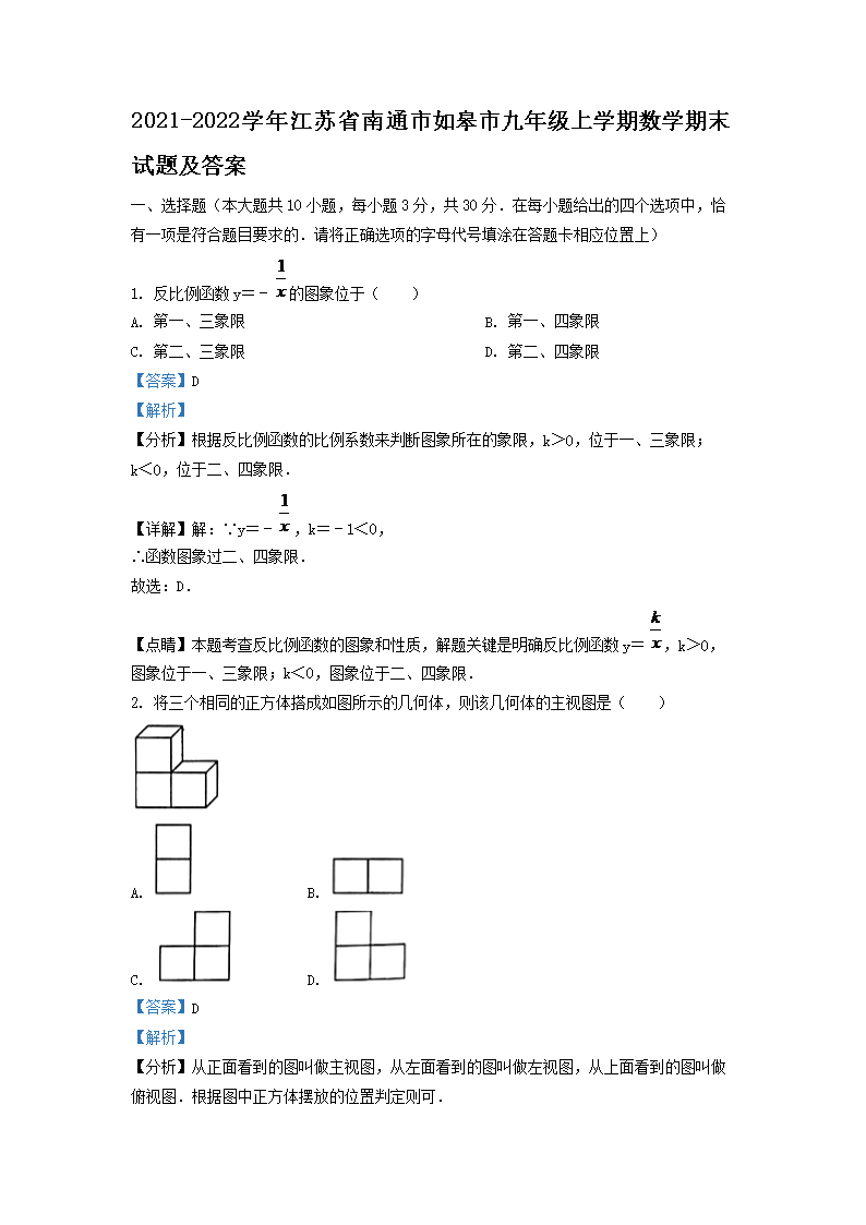 【文档预览】 文档大全网整理发布2021-2022学年江苏省南通市如皋市九年级上学期数学期末试题及答案(Word版),前五页预览如下: