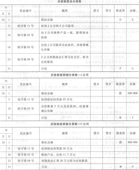 U公司应收账款总分类账共设“J公司”和“z公司”两个明细账,10月份尚未完成的总账和明细账如下(单位:元):