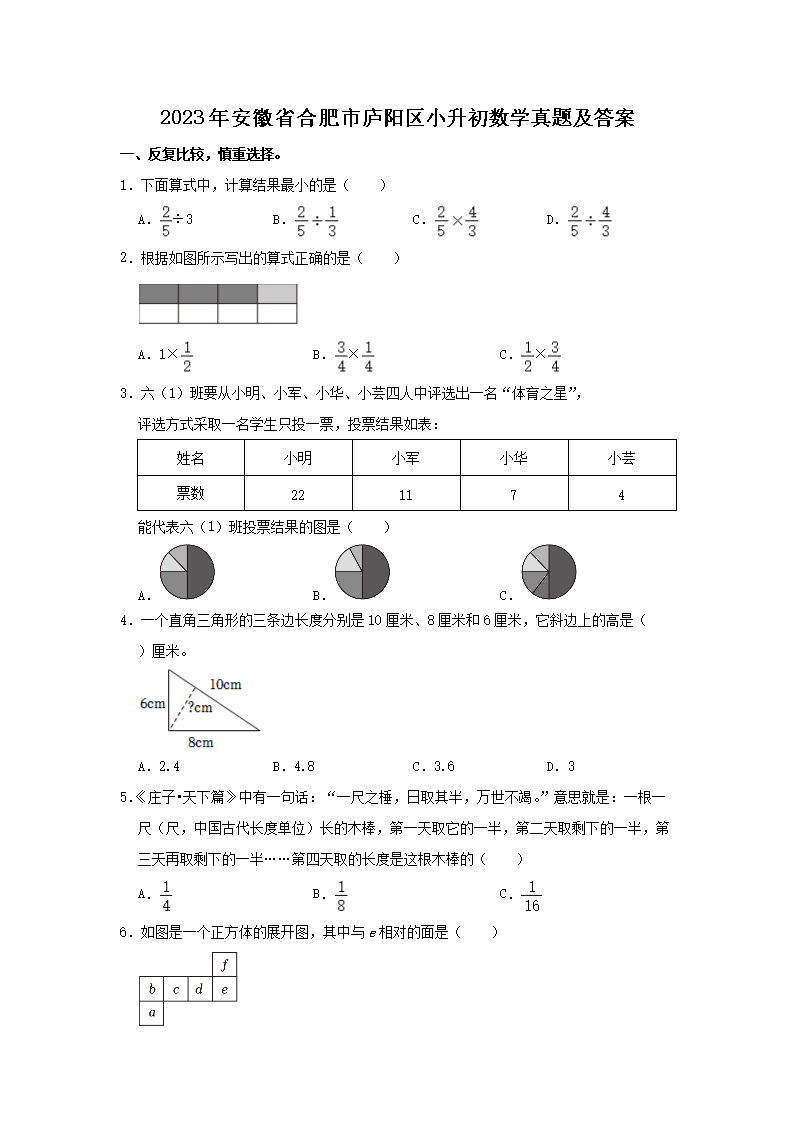 【文档预览】 文档大全网整理发布2023年安徽省合肥市庐阳区小升初数学真题及答案(Word版),前五页预览如下: