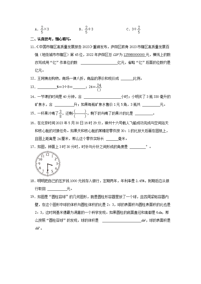 2023年安徽省合肥市庐阳区小升初数学真题及答案(Word版)09-21
