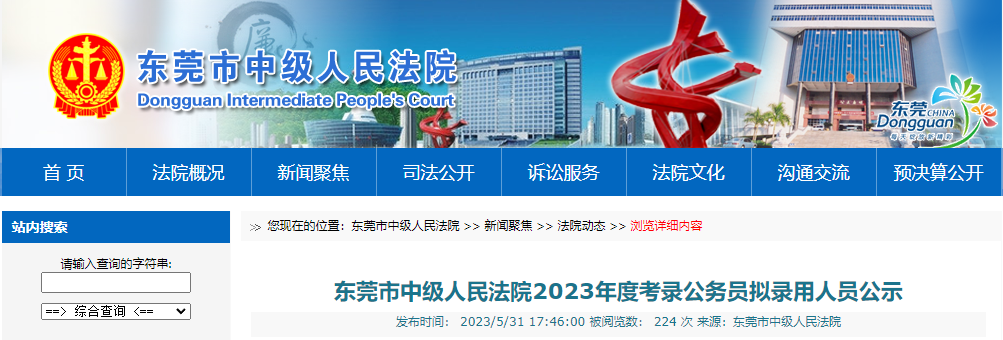 2023年广东东莞市中级人民法院考录公务员公示时间:6月1日-7日06-02