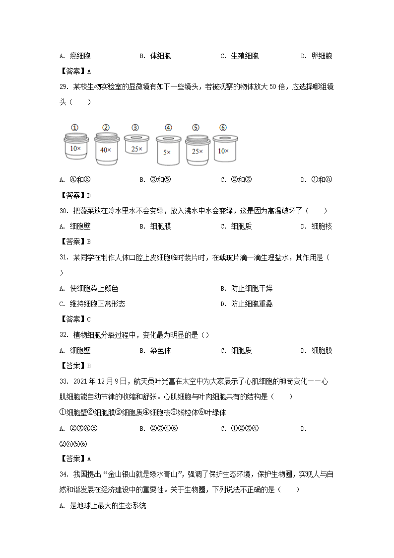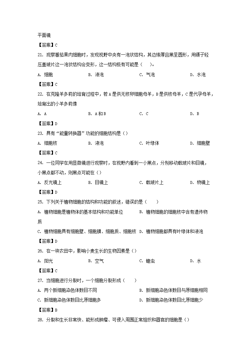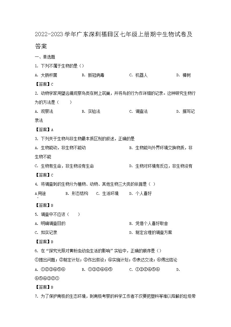 2022-2023学年广东深圳福田区七年级上册期中生物试卷及答案(Word版)09-22