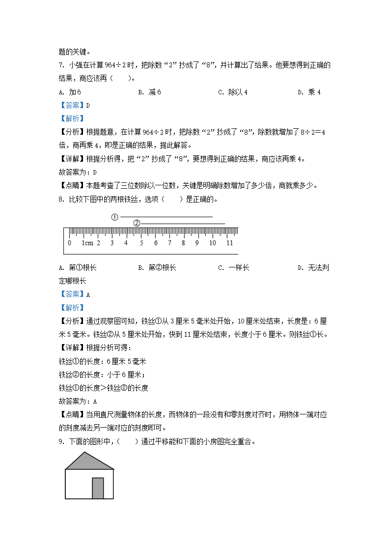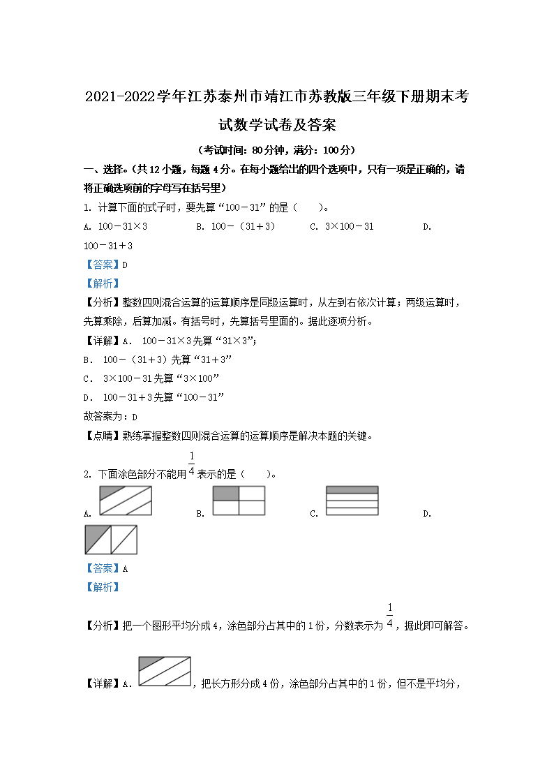 2021-2022学年江苏泰州市靖江市苏教版三年级下册期末考试数学试卷及答案(Word版)07-26