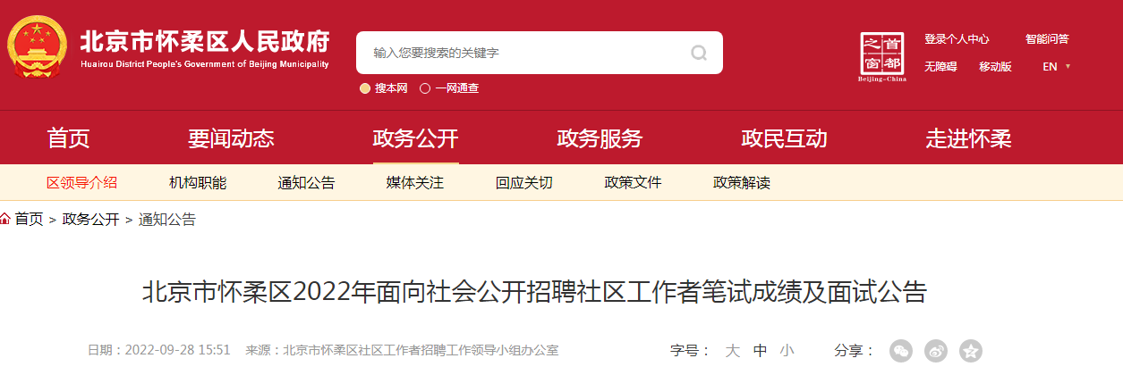 2022年北京市怀柔区面向社会公开招聘社区工作者笔试成绩及面试公告09-30