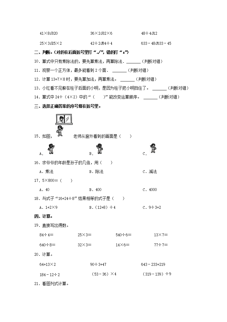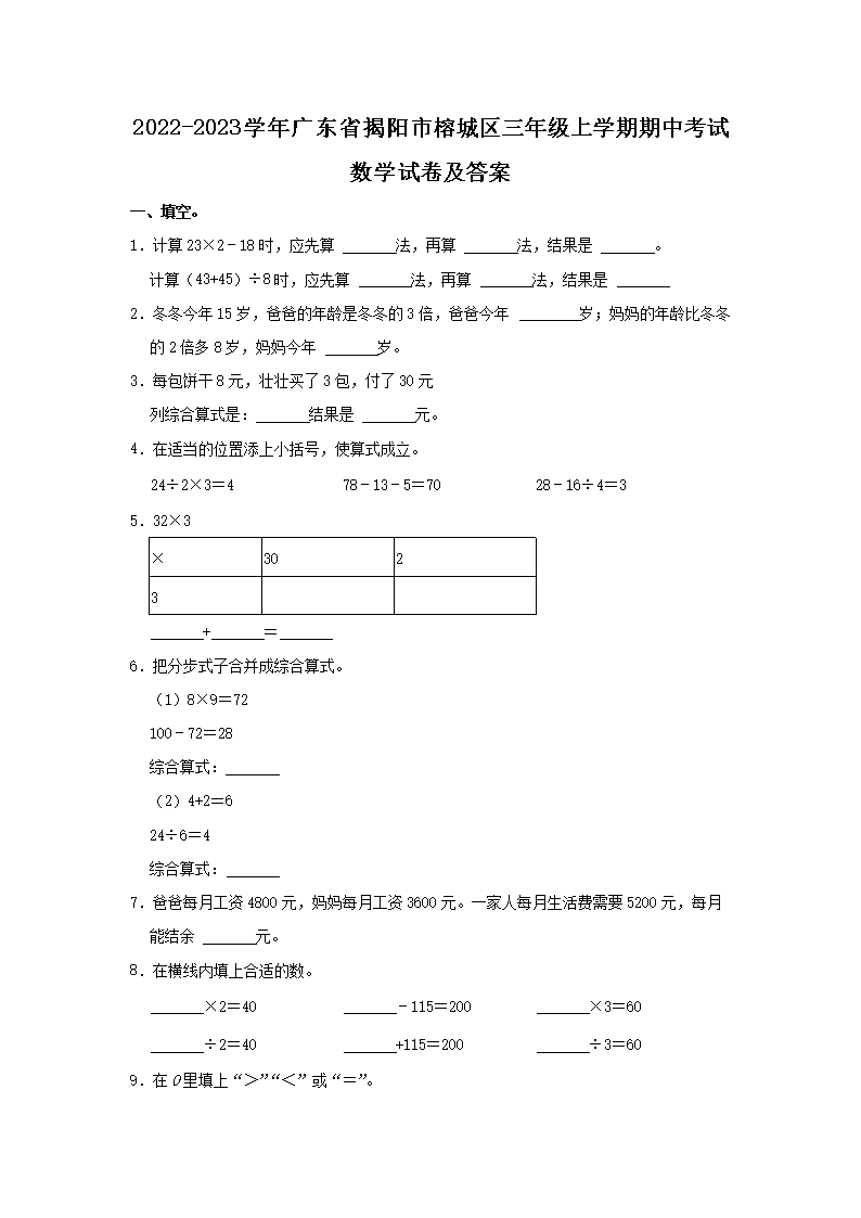 2022-2023学年广东省揭阳市榕城区三年级上学期期中考试数学试卷及答案(Word版)08-09
