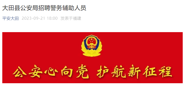 【#招警考试# #2023年福建三明大田县公安局招聘警务辅助人员公告(4名)#】®文档大全网从平安大田获悉,2023年福建三明大田县公安局招聘警务辅助人员4名。报名时间:9月21日-26日,考试时间:另行通知,更多事宜请参考阅读《招聘公告》,官方公告原文如下:
