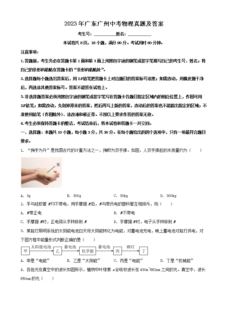 【文档预览】 文档大全网整理发布2023年广东广州中考物理真题及答案(Word版),前五页预览如下: