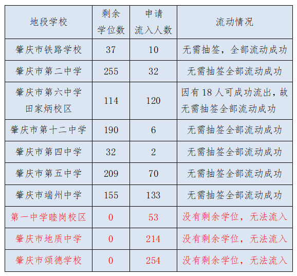 按照流动抽签办法,剩余学位多于申请流入人数的,全部流动成功;剩余学位少于申请流入人数,通过抽签解决;没有剩余学位的,无法抽签流入。根据报名情况以及资料核实情况,第一中学睦岗校区、肇庆市地质中学、肇庆市颂德学校因报名人数超过招生计划,没有剩余学位,无法流入;其他学校剩余学位充足,无需抽签全部流入成功。