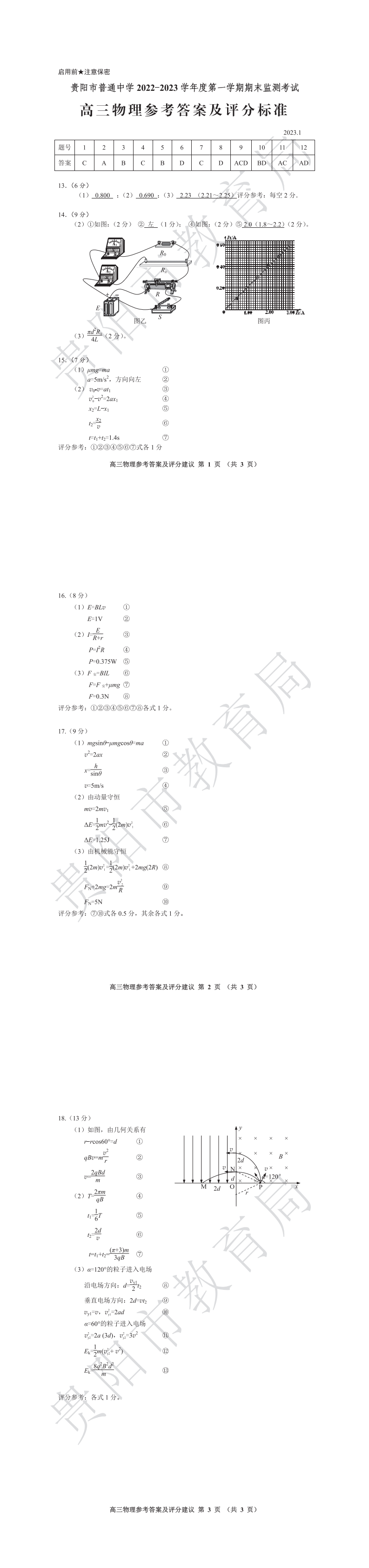 原文标题:贵阳市普通中学2022-2023学年度第一学期期末监测考试高三物理参考答案及评分建议