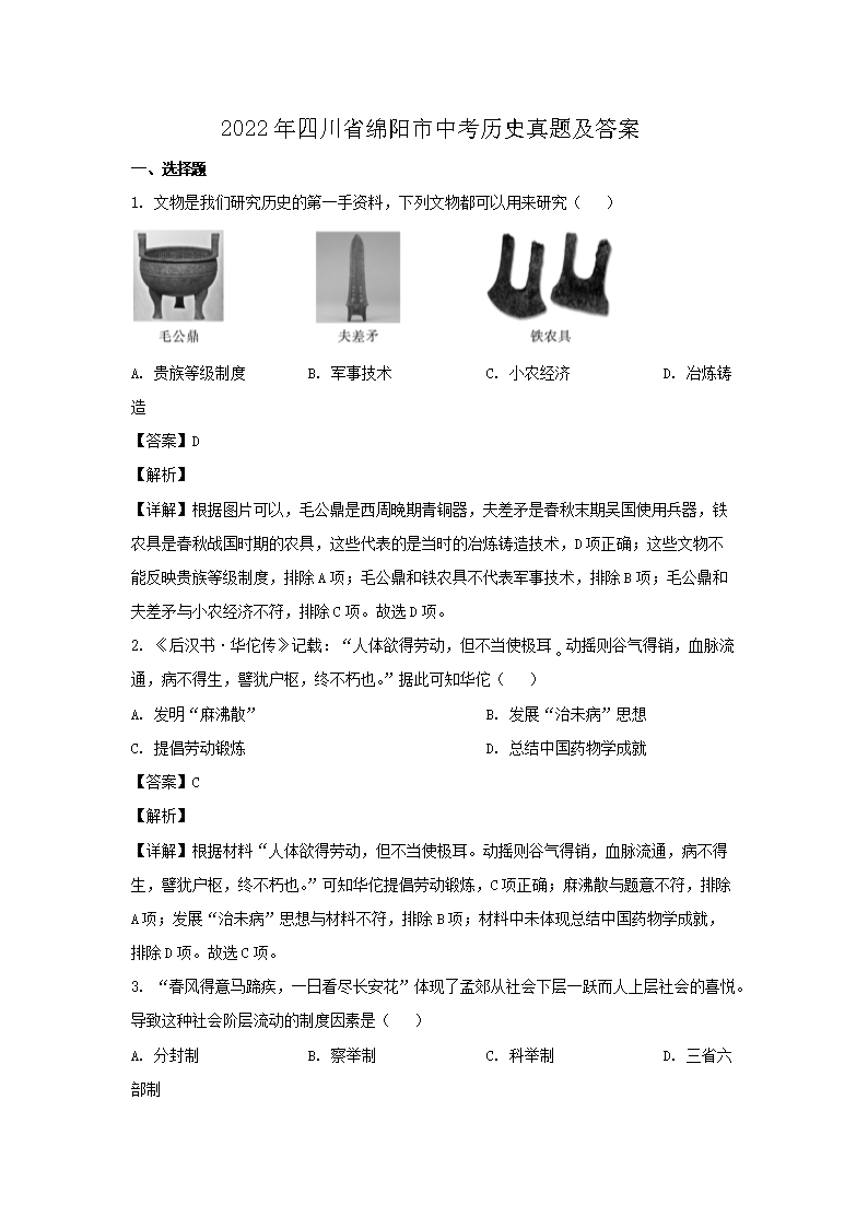 2022年四川省绵阳市中考历史真题及答案(Word版)05-31