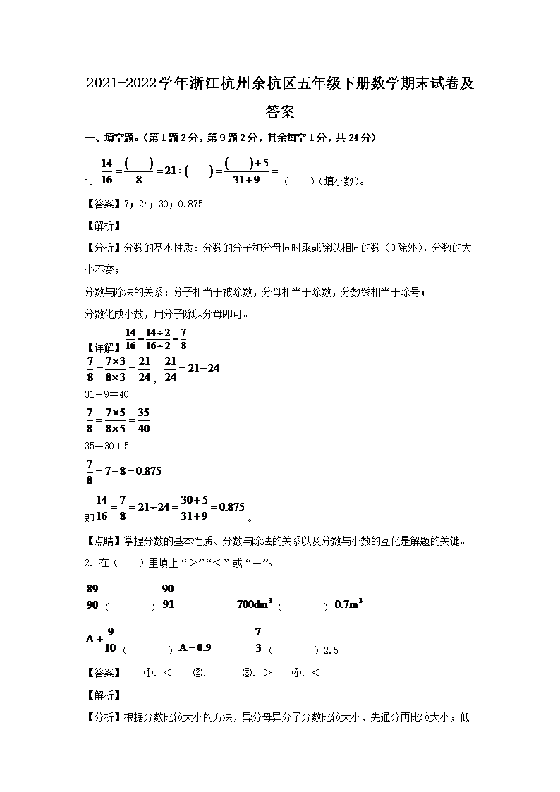 【文档预览】 文档大全网整理发布2021-2022学年浙江杭州余杭区五年级下册数学期末试卷及答案(Word版),前五页预览如下: