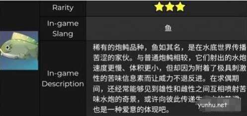 稀有的炮品种,鱼如其名,是在水底世界传播苦涩的家伙。与普通炮相较,它们射出的水炮速度更慢、体积更小,但却因为附着了极具刺激性的苦味信息素而让威力不退反进。在求偶期间,还经常能够见到雄性和雌性之间互相喷射苦味水炮的奇景,或许向彼此传递生命中的苦涩,也是一种爱意的体现吧。
