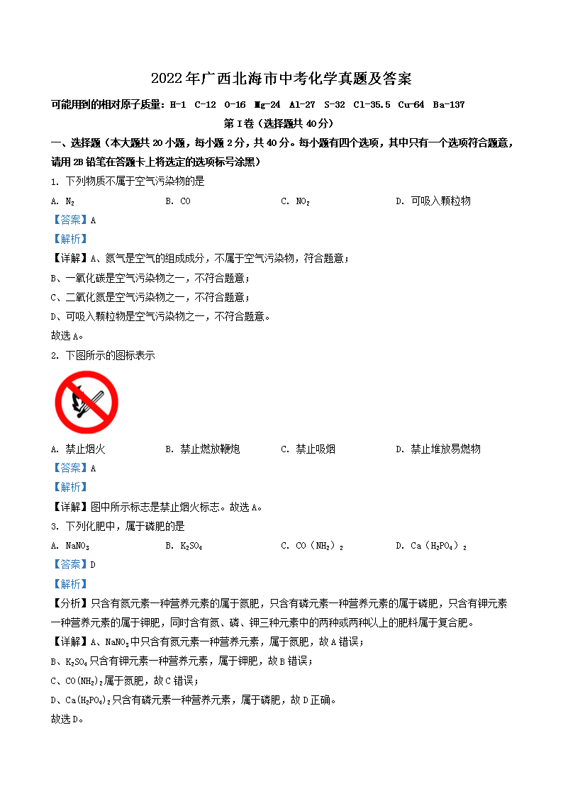 【文档预览】 文档大全网整理发布2022年广西北海市中考化学真题及答案(Word版),前五页预览如下: