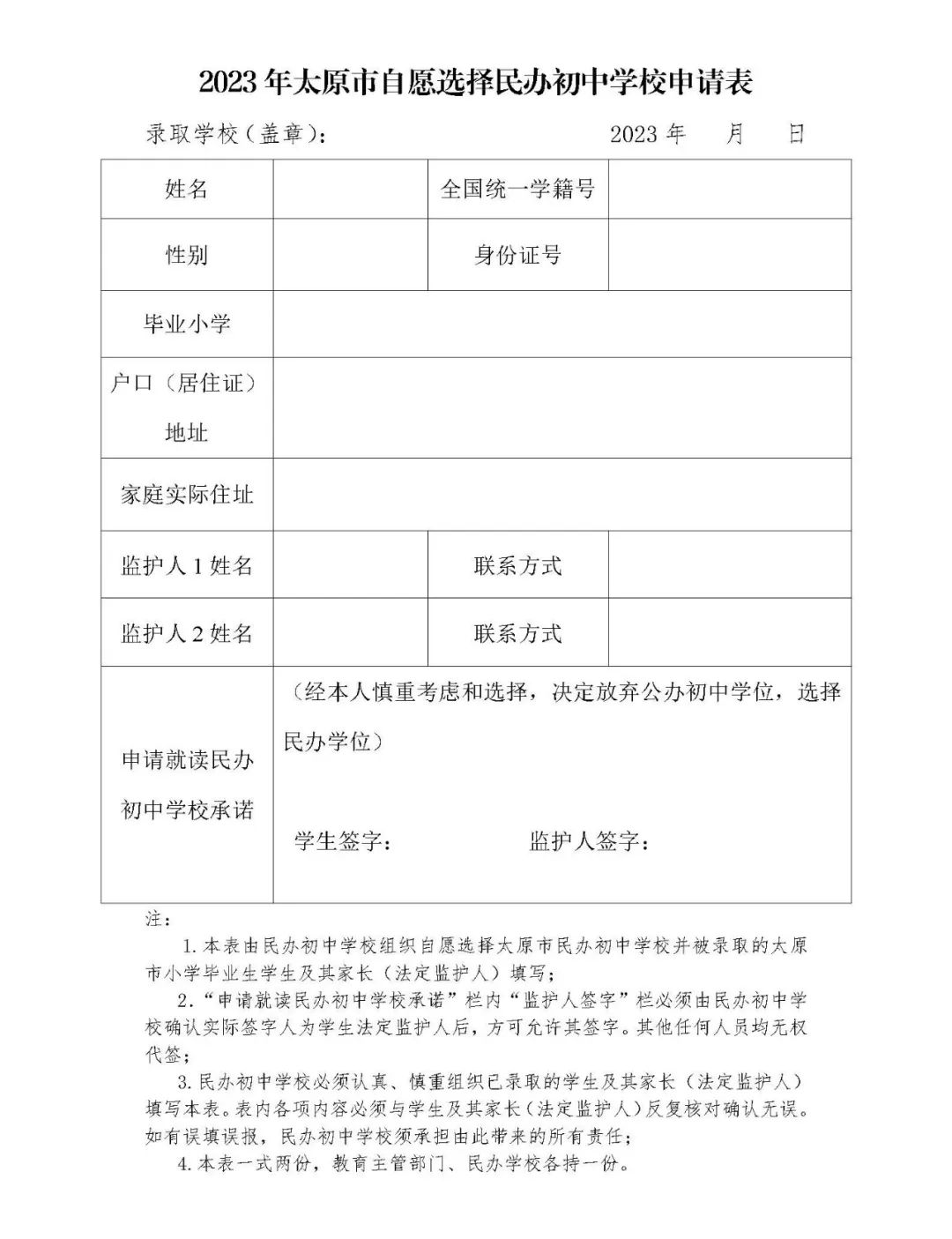 持学生《小学毕业证》和《2023年太原市自愿选民办初中学校申请表(一式两份)》(再次登录当时报名的网址,在系统内找到“查看打印”按钮,点击后下载打印,系统会自动将内容填写完整,只需打印出来手写签字交回即可,下方仅为样表),于8月3日8:30—11:30到我校侯家巷校区南院多功能厅(太原市迎泽区侯家巷9号),签字确认就读我校。未在规定时间内到校确认的,视为自动放弃录取资格。