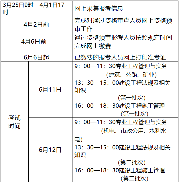 2022年度我省二级建造师执业资格考试时间定于6月11、12日举行,考点设在各设区市。请各市人力资源和社会保障局人事(职称)考试中心按照工作计划(附件1)认真做好各项工作。辛集市、定州市和雄安新区不设报名点,报名及其他考务管理工作分别由石家庄市和保定市考试管理机构负责。