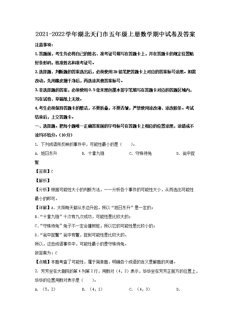 【文档预览】 文档大全网整理发布2021-2022学年湖北天门市五年级上册数学期中试卷及答案(Word版),前五页预览如下: