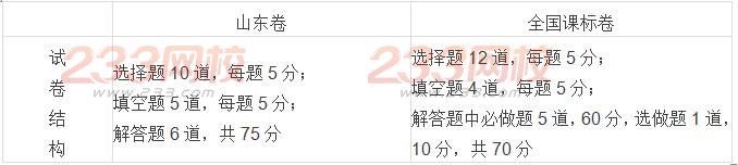 全国卷在客观题上(选择题)比山东卷多了两道题,主观题(填空、 解答)全国卷比山东卷少一道题,全国卷的主观题的分值共为90分,山东卷主观题的分值共为100分,也就是说,山东卷更强化对于主观题的考查;从2017高考考试大纲修改内容来看,2017年全国卷的试卷结构上不会产生任何变化。