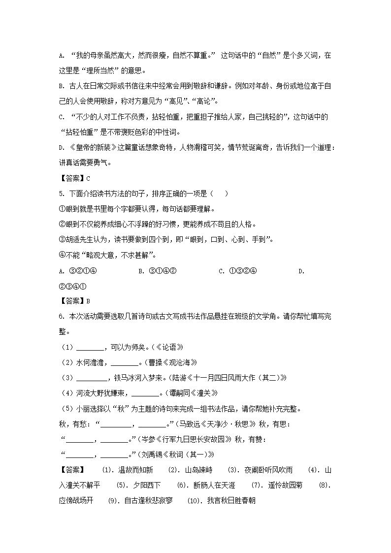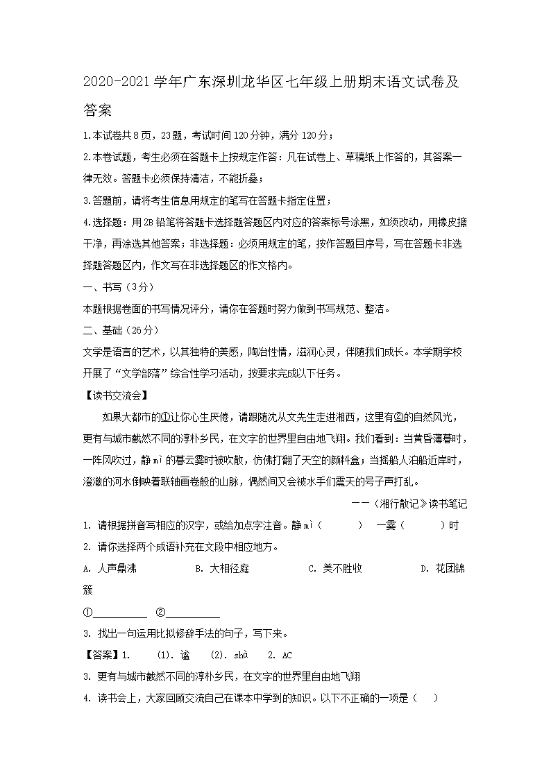 【文档预览】 文档大全网整理发布2020-2021学年广东深圳龙华区七年级上册期末语文试卷及答案(Word版),前五页预览如下: