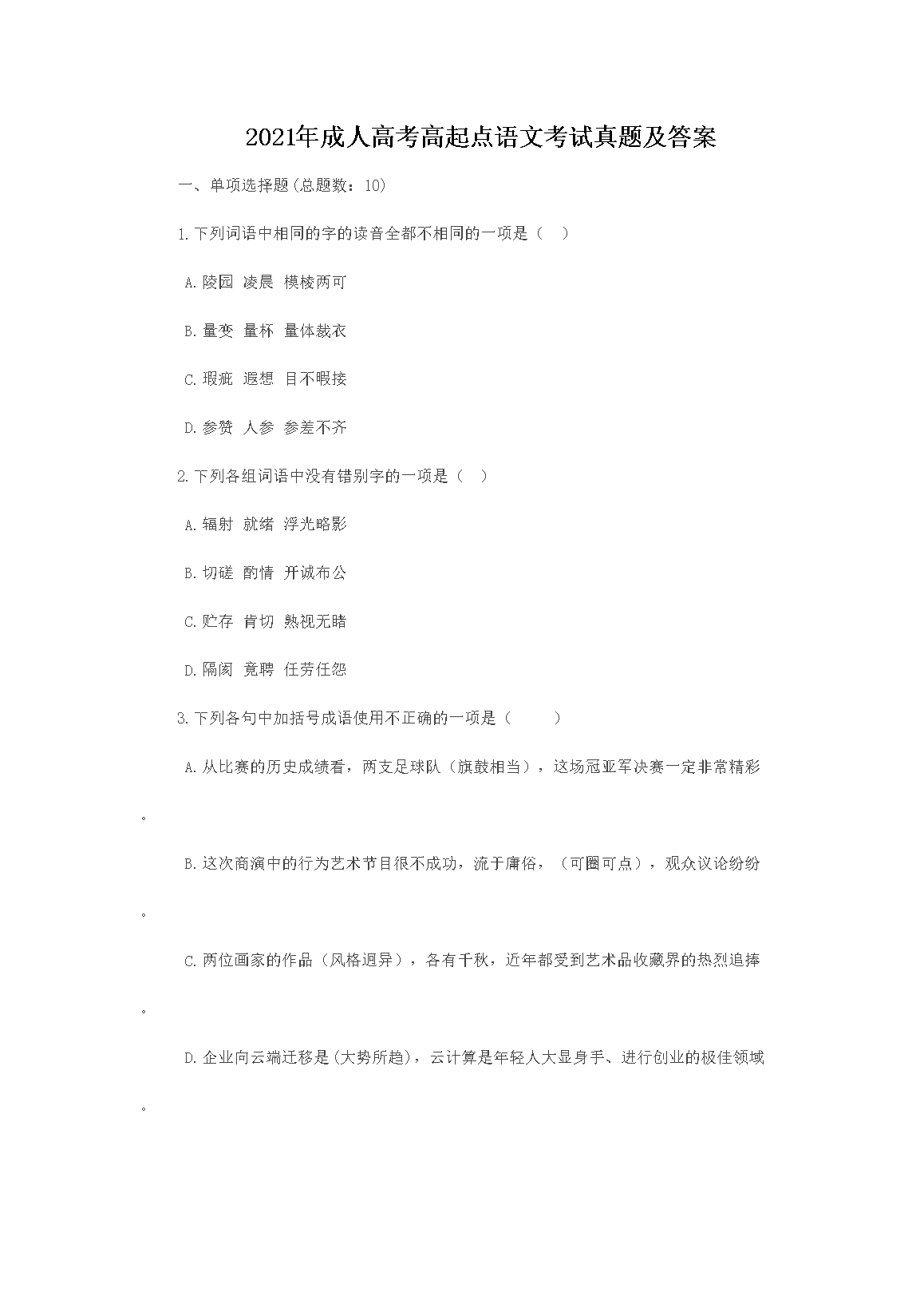【文档预览】 文档大全网整理发布2021年成人高考高起点语文考试真题及答案(Word版),前五页预览如下: