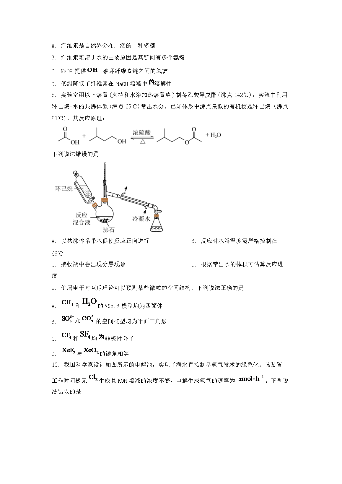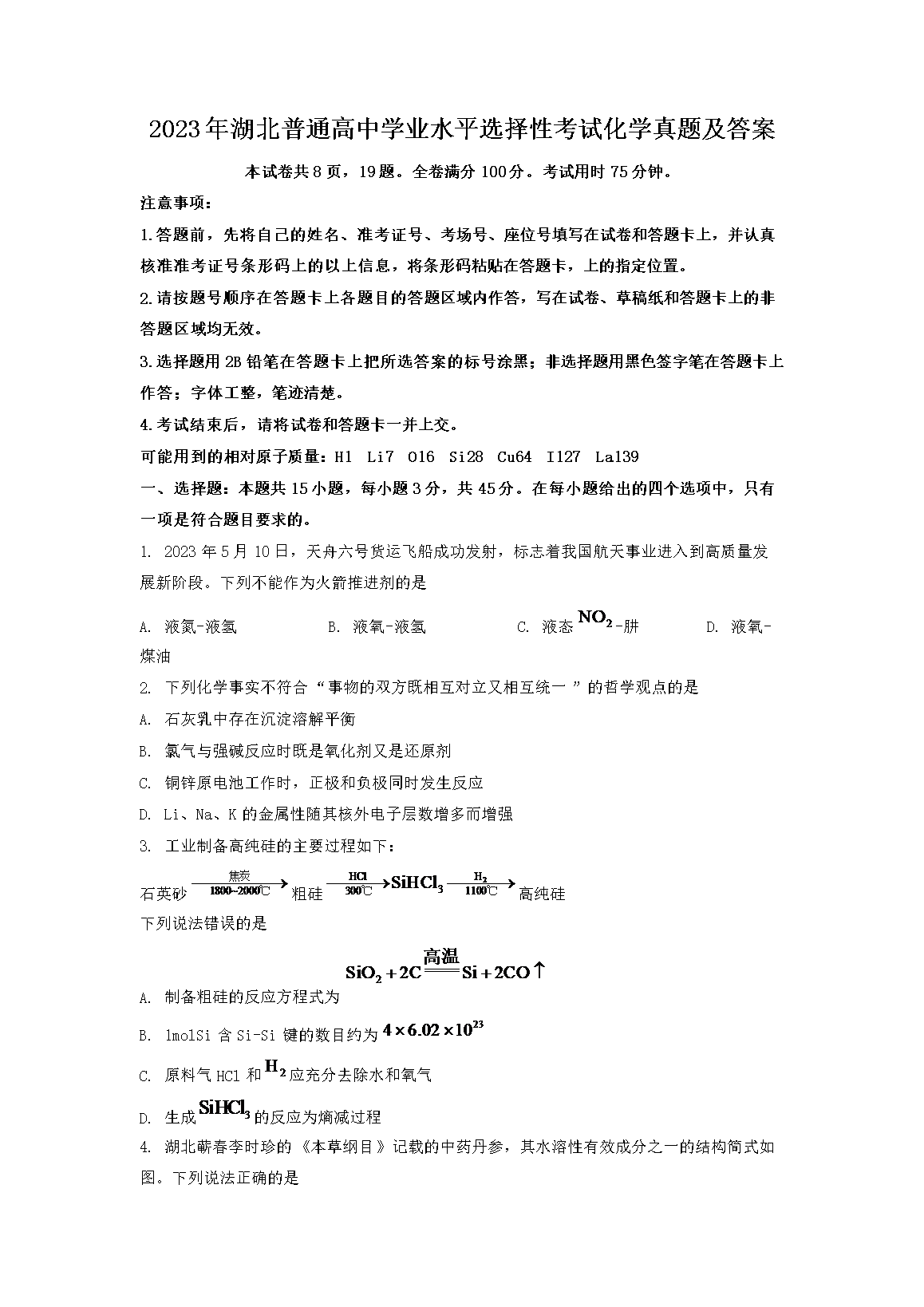 2023年湖北普通高中学业水平选择性考试化学真题及答案(Word版)06-19