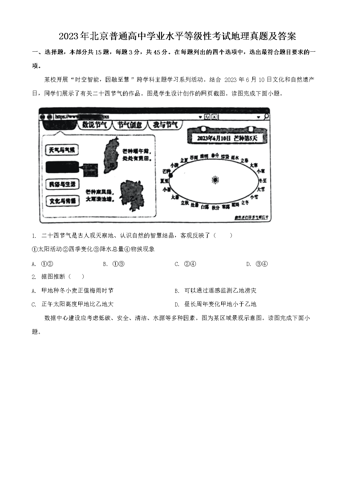 2023年北京普通高中学业水平等级性考试地理真题及答案(Word版)06-23
