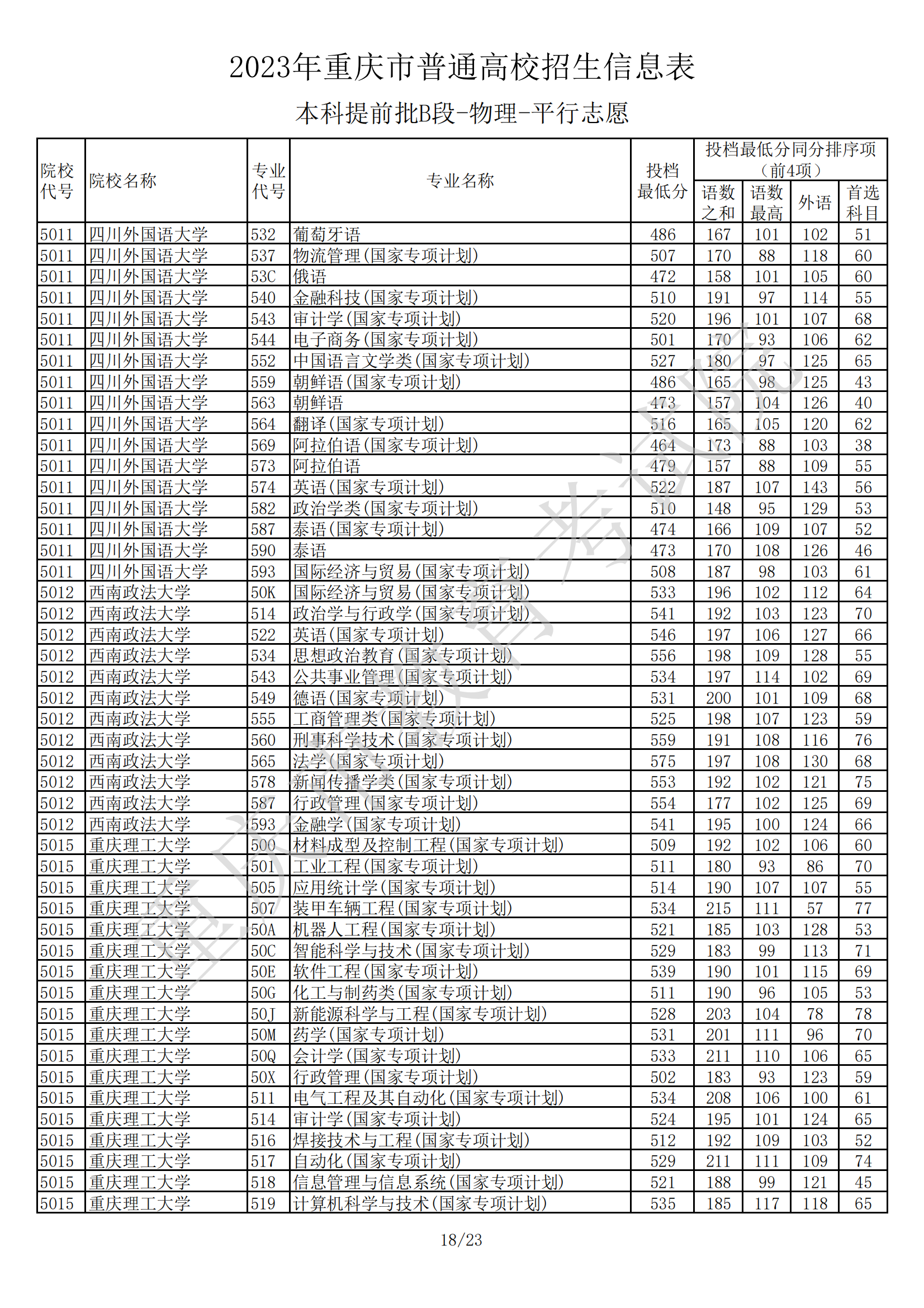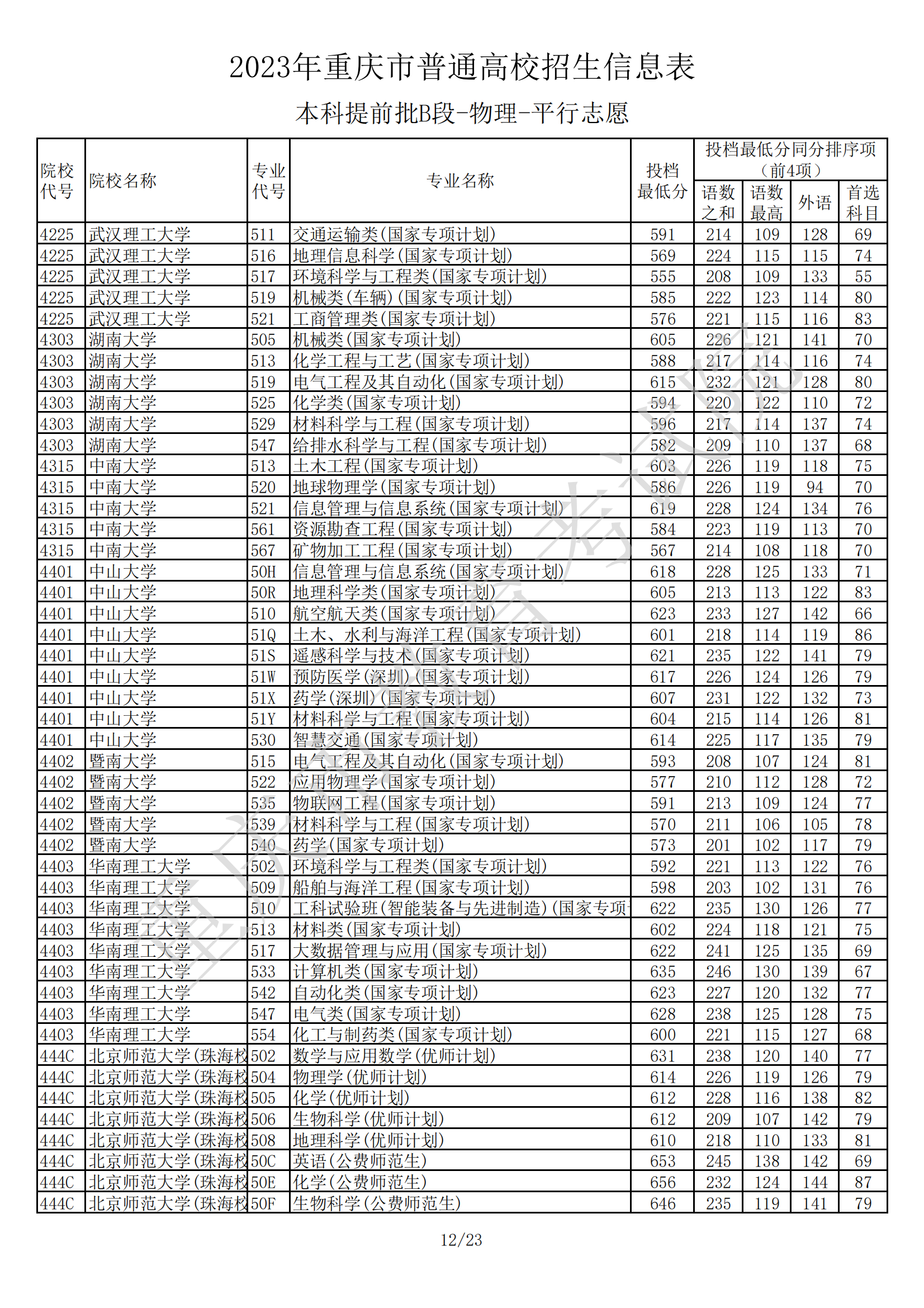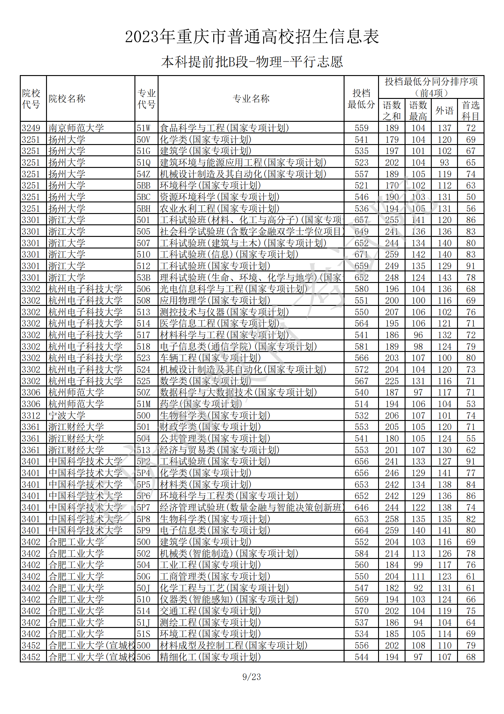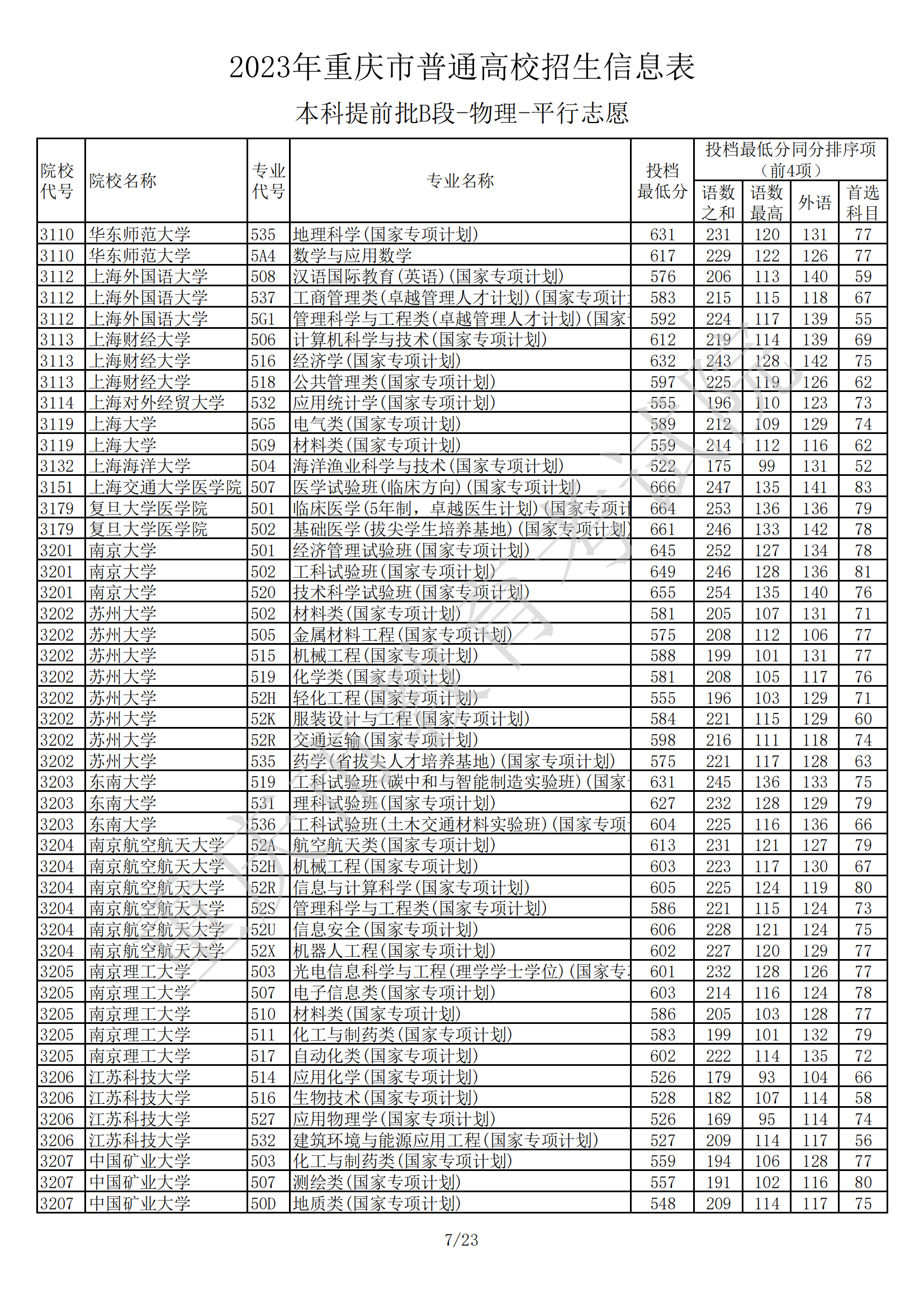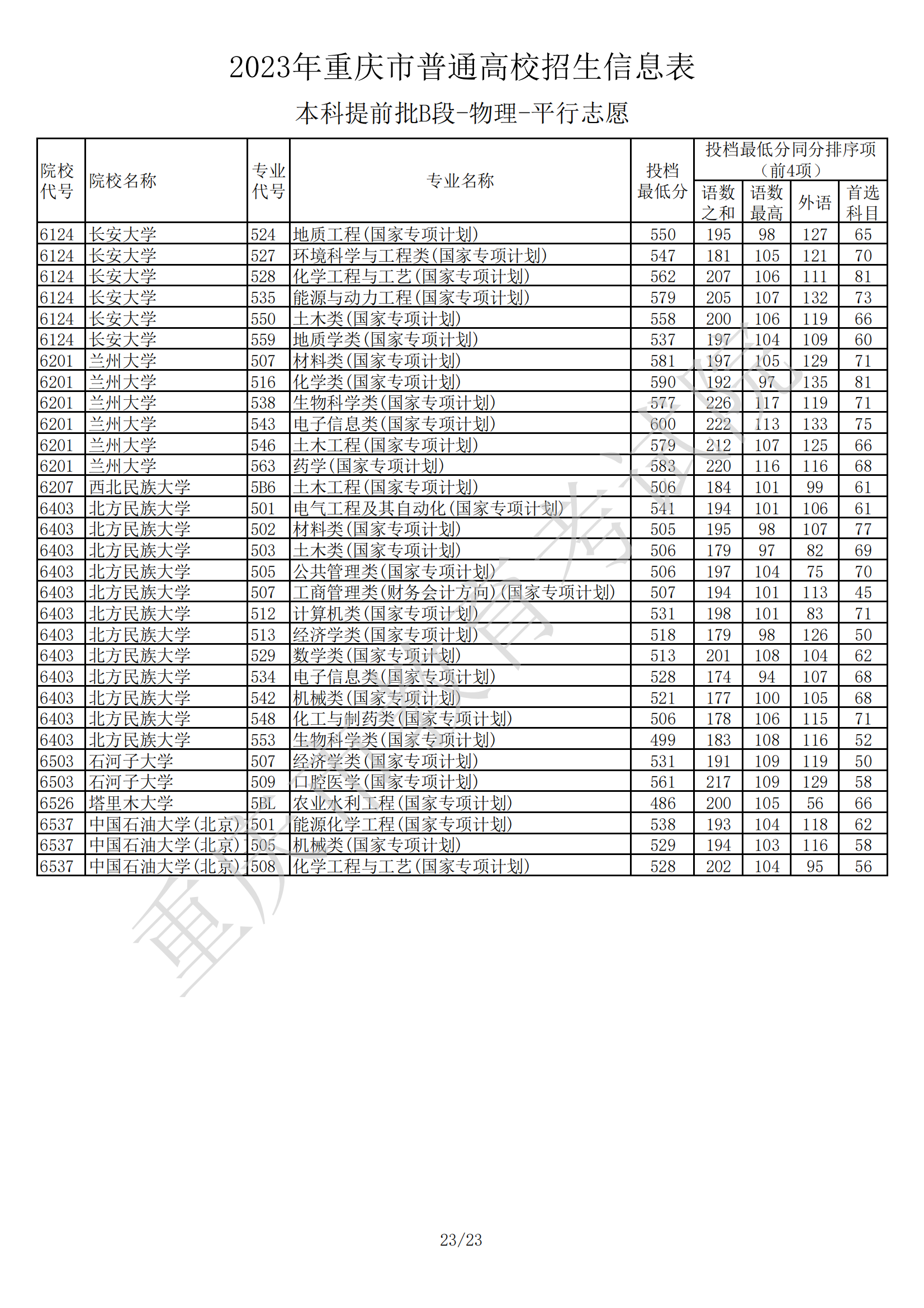 2023年重庆市普通高校招生信息表(本科提前批B段-物理-平行志愿)07-20