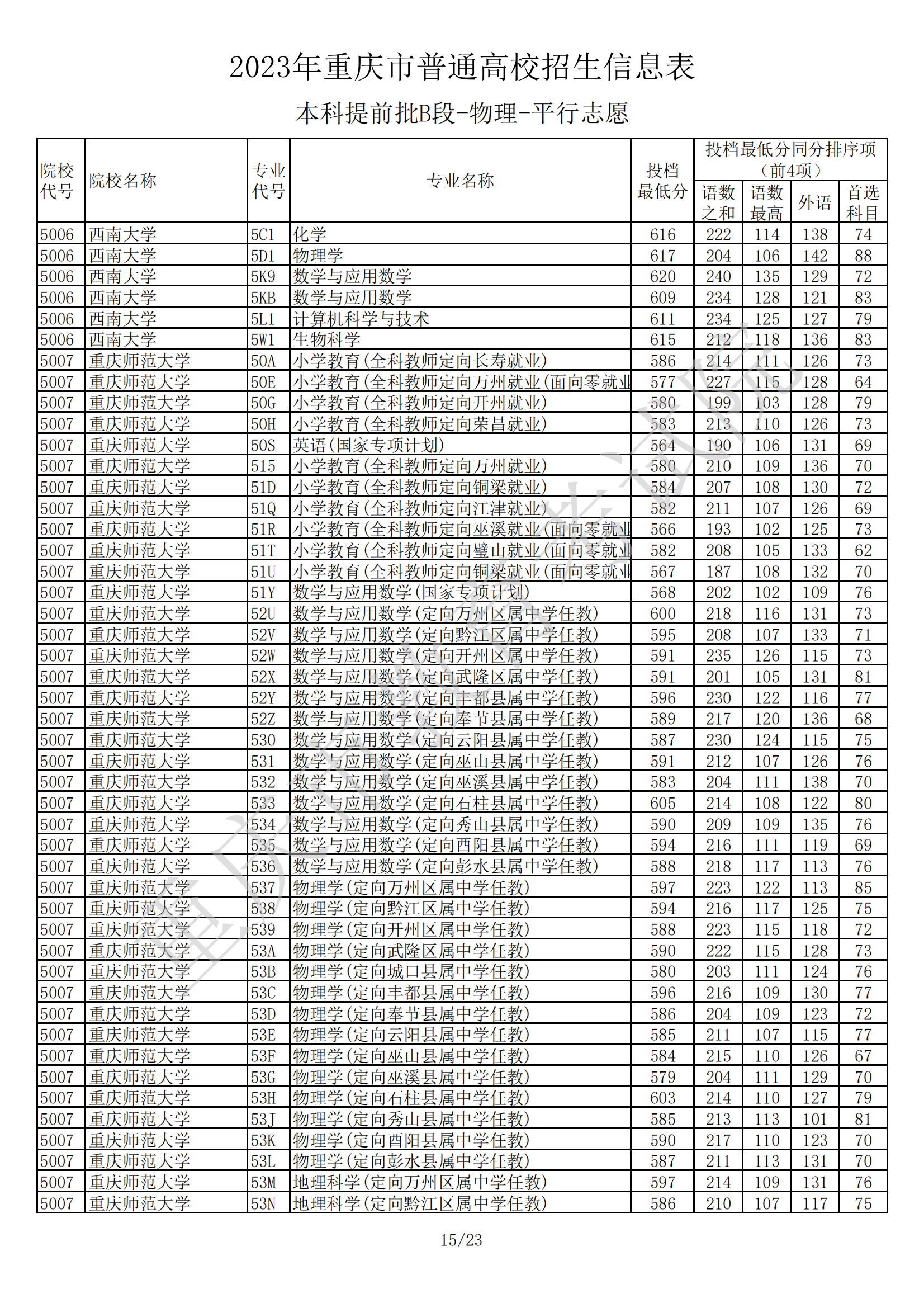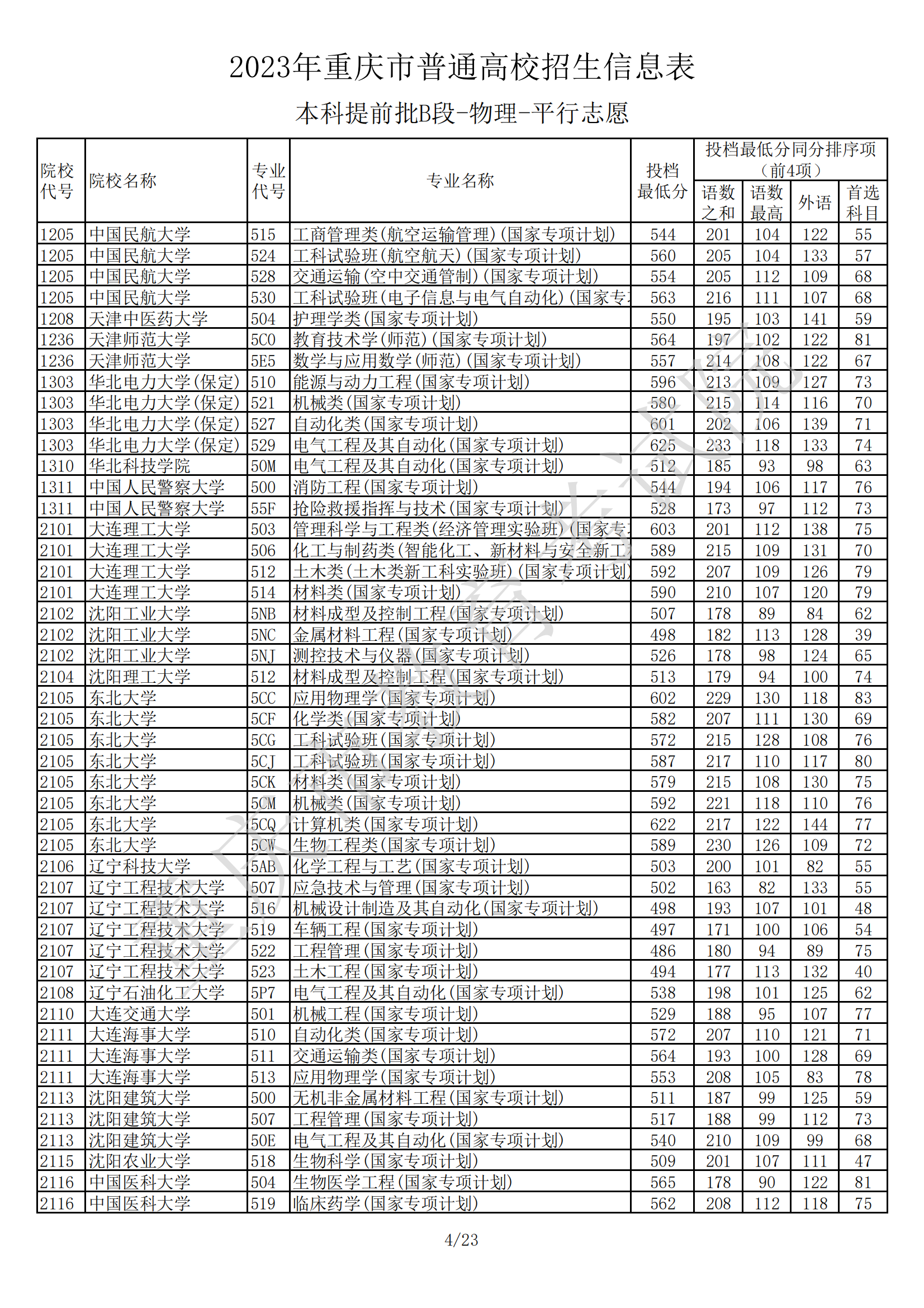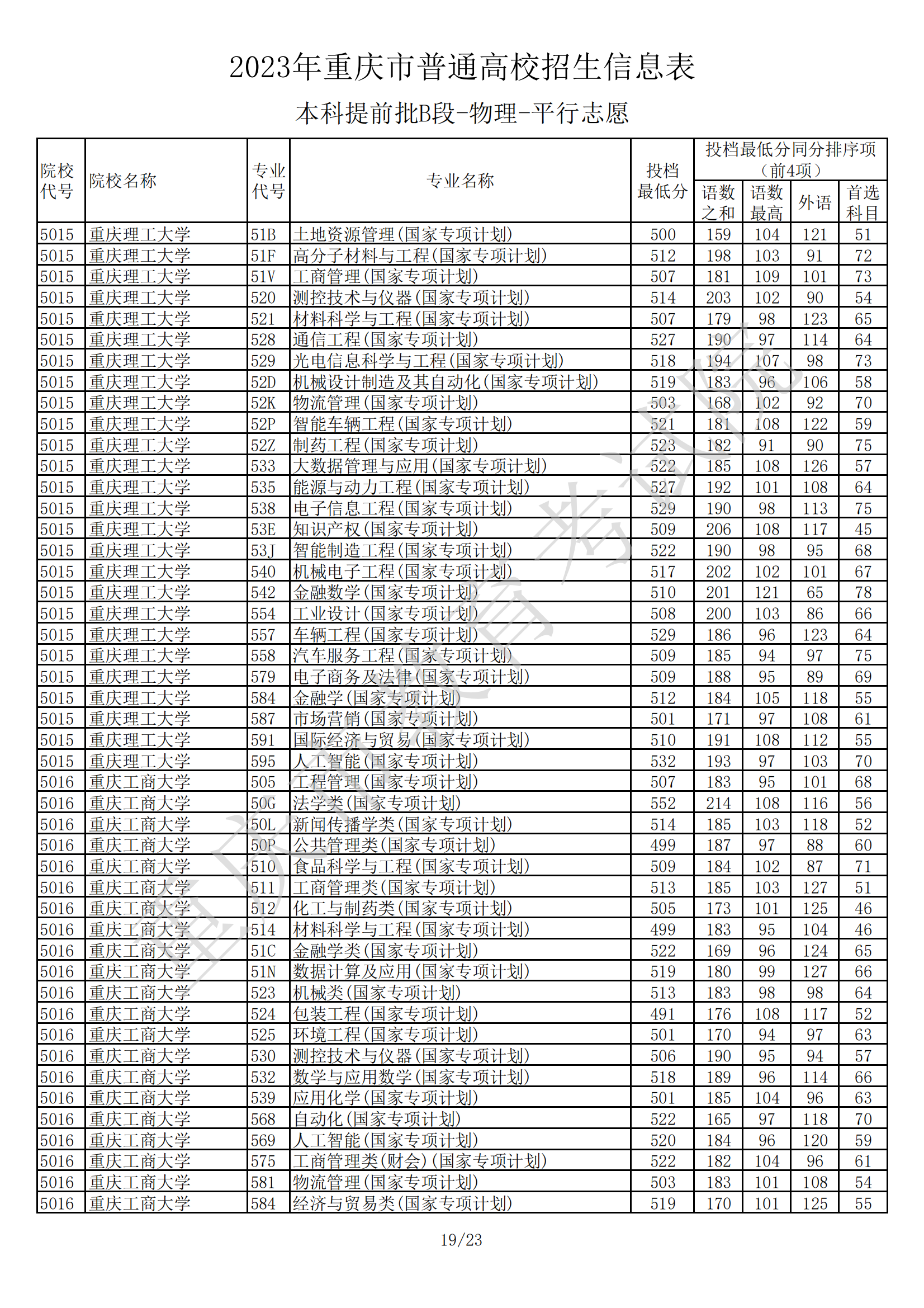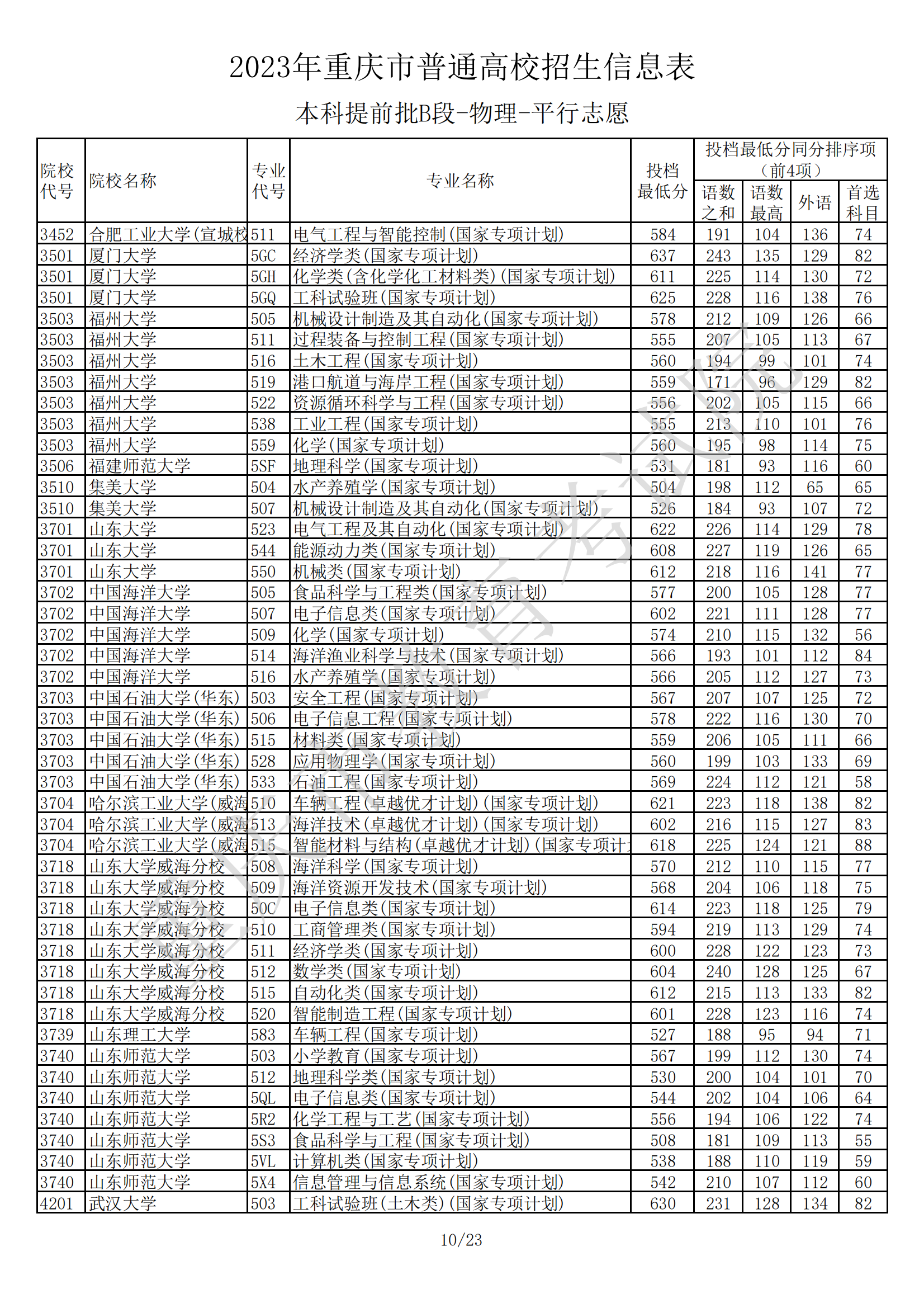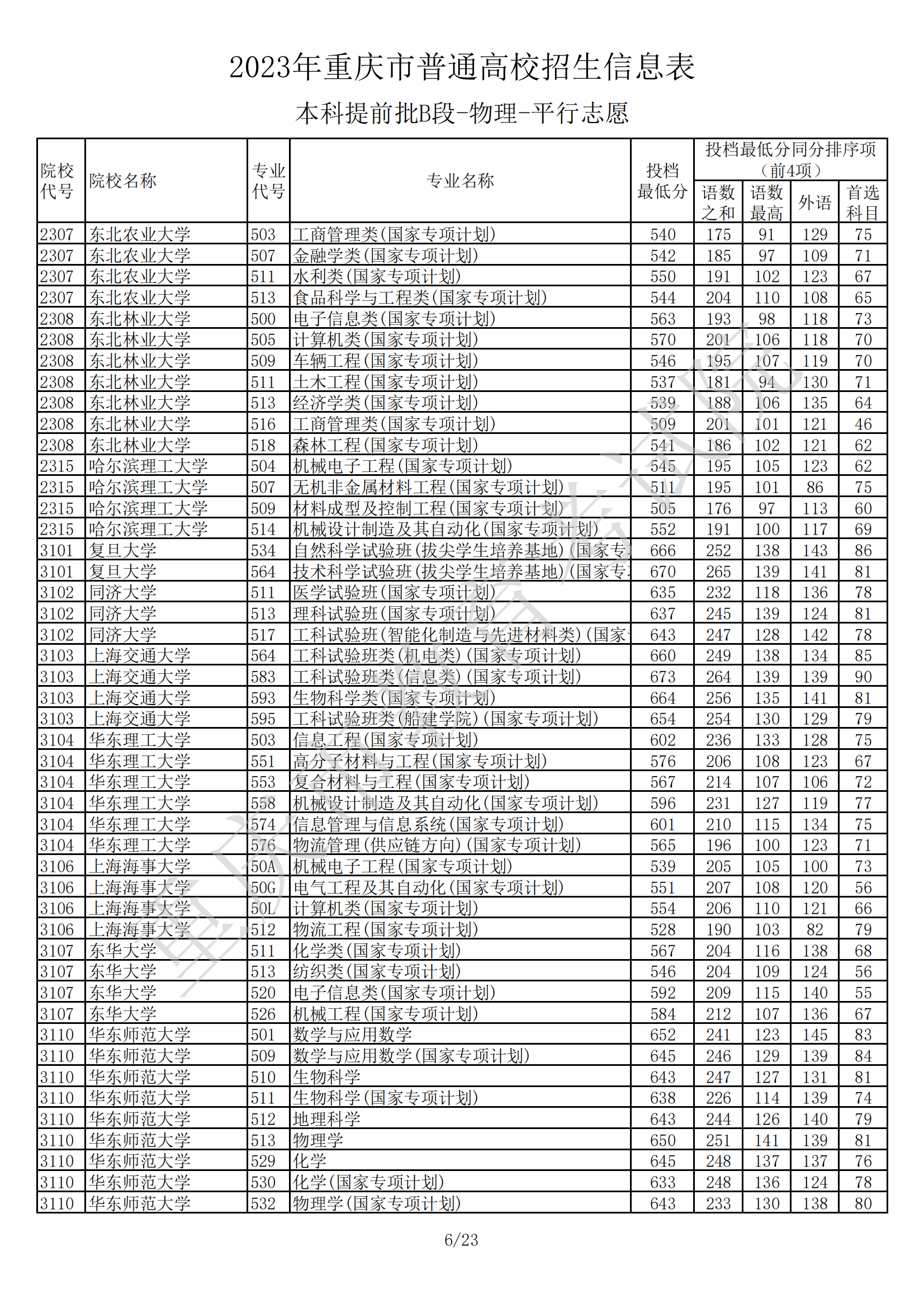 2023年重庆市普通高校招生信息表(本科提前批B段-物理-平行志愿)07-20