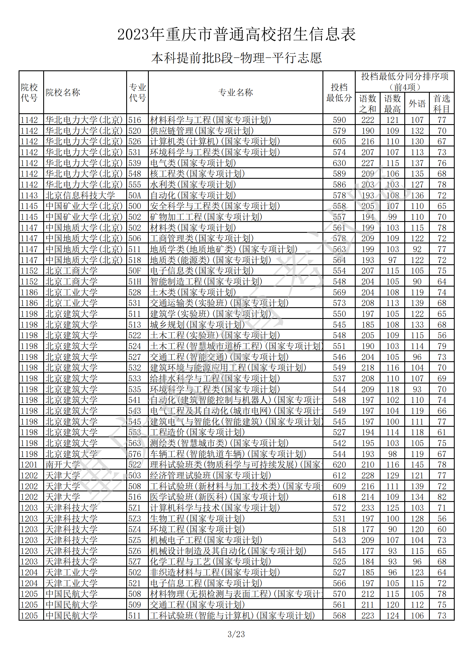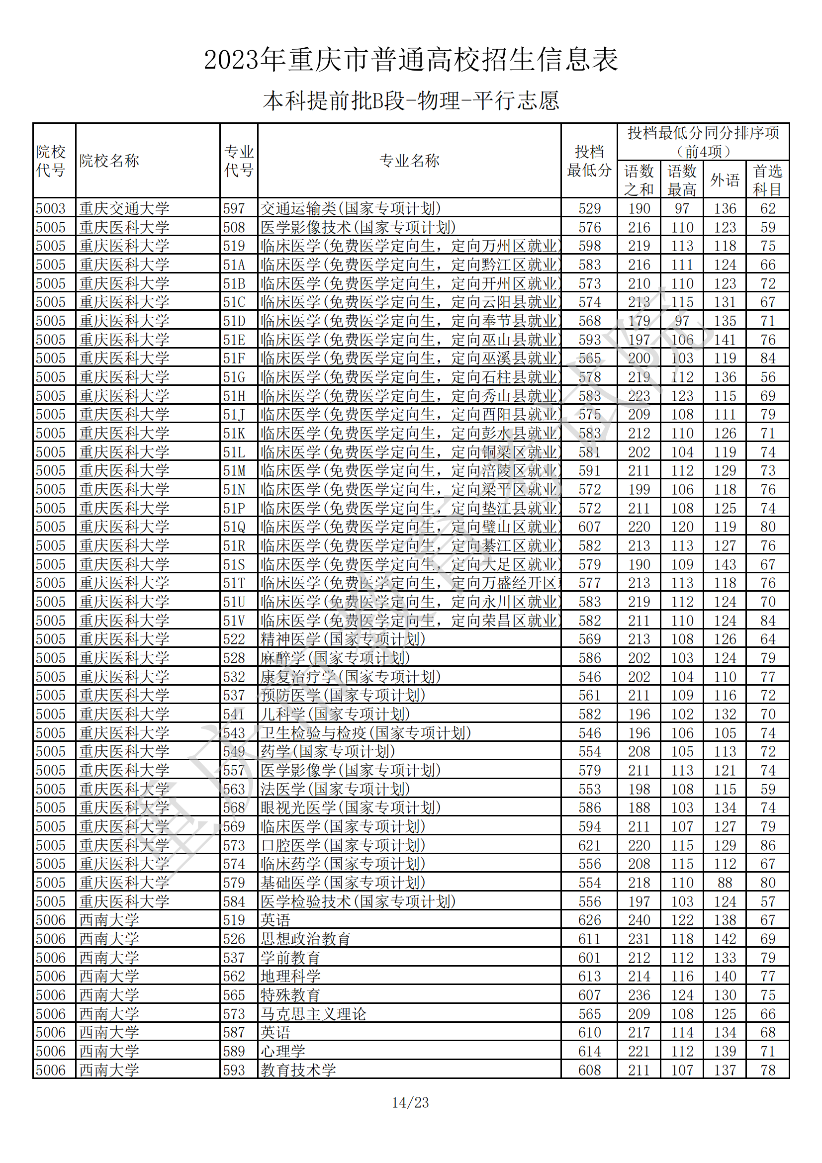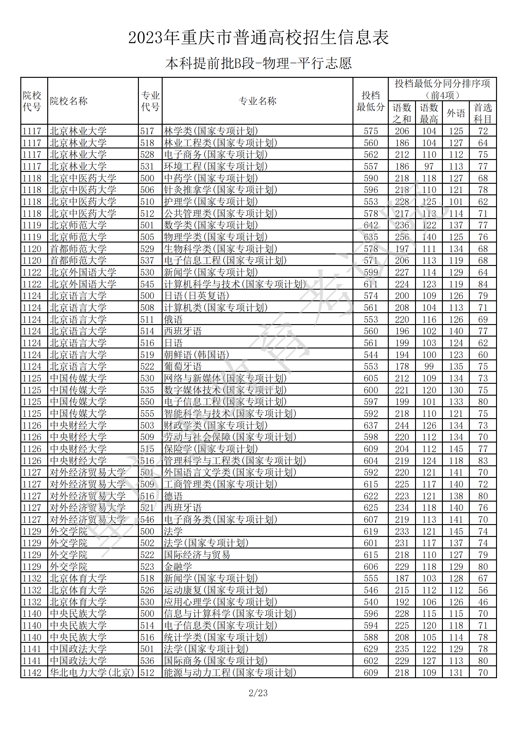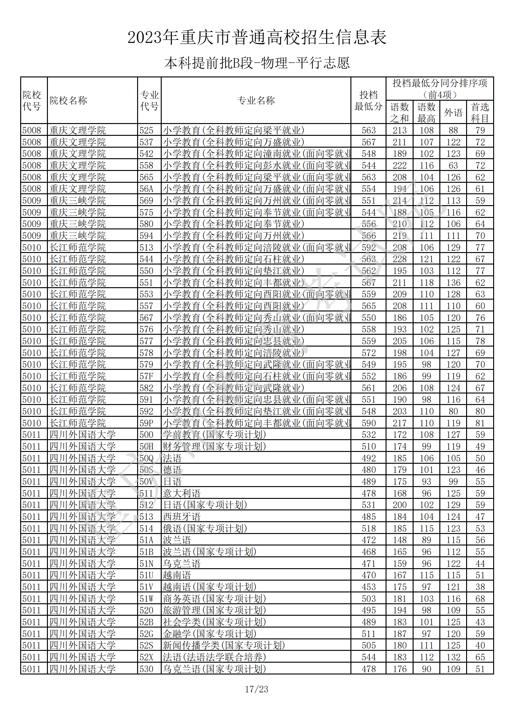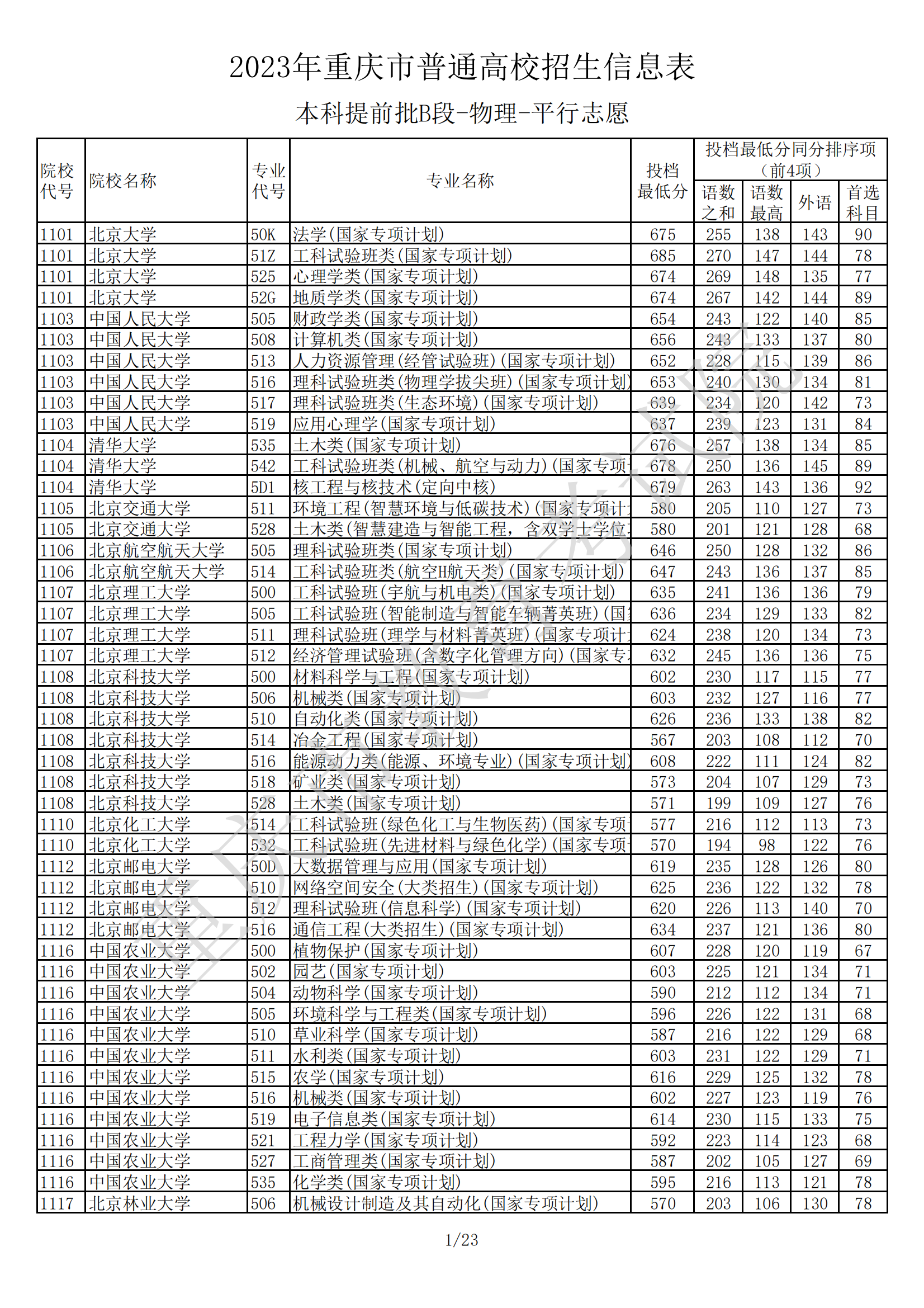 2023年重庆市普通高校招生信息表(本科提前批B段-物理-平行志愿)07-20