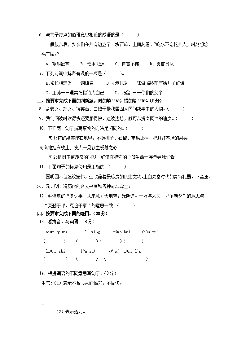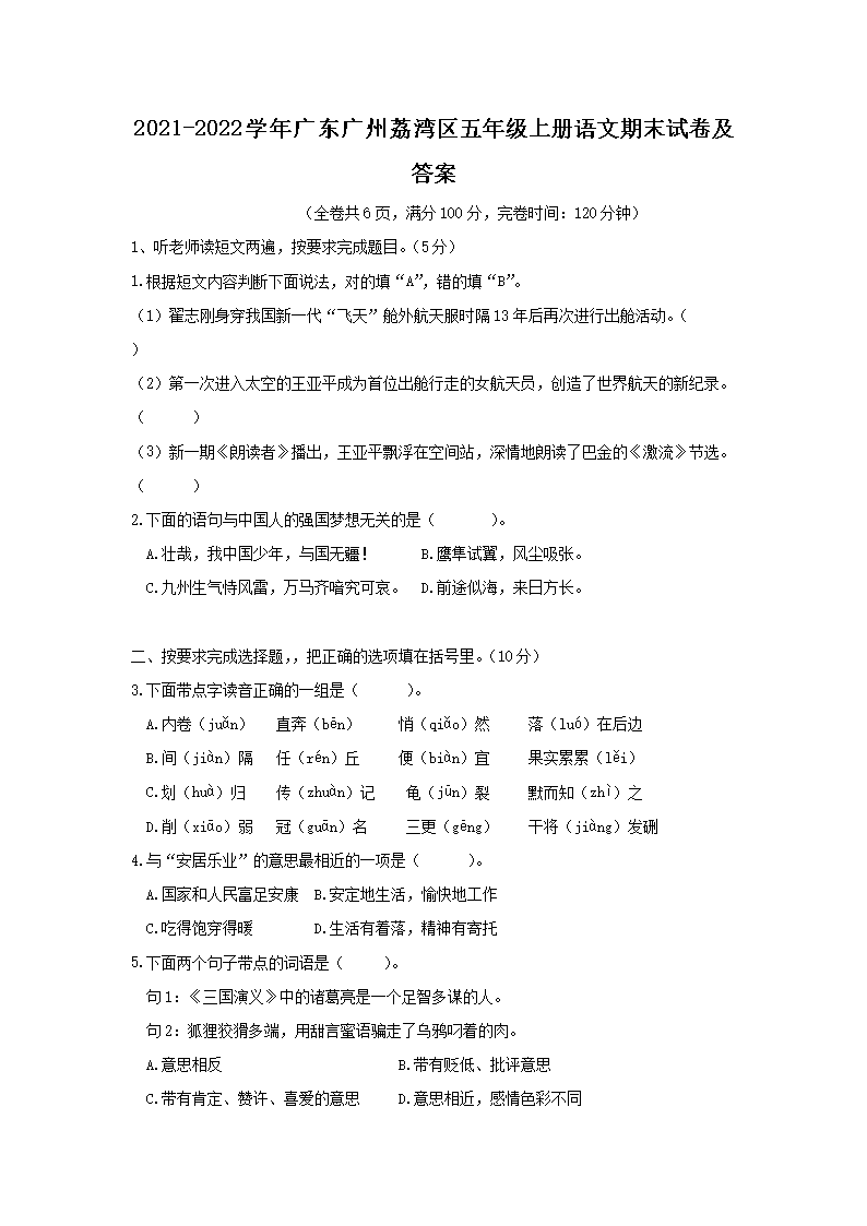 2021-2022学年广东广州荔湾区五年级上册语文期末试卷及答案(Word版)08-01