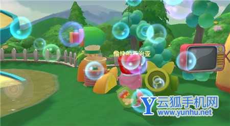 派对广场就是NPC琦琦的所在地,里面充满了各种各样的小彩蛋。比如触摸这个绿色的泡泡机,机会持续五秒吹出泡泡。广场中的小木马、摇摇车、大西瓜都可以触发小彩蛋哦!